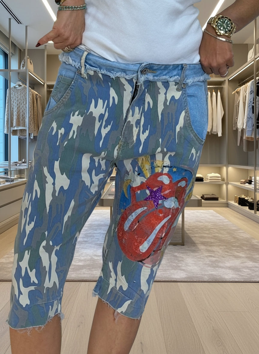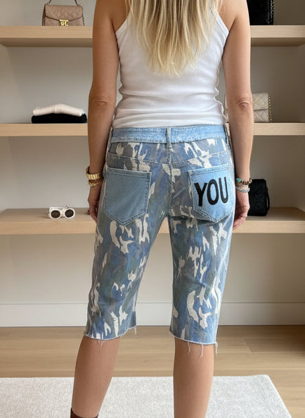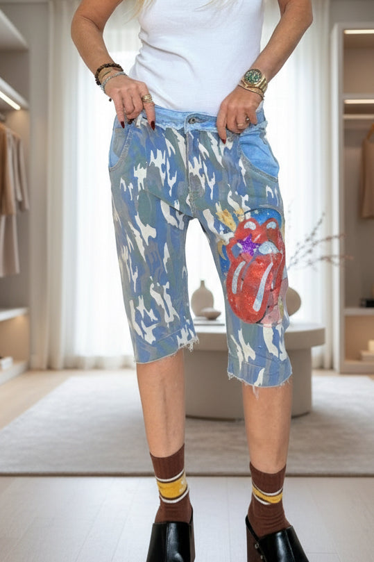 מכנס ג’ינס בעבודת יד של דנה עם הדפס קמופלאז’ וציור ייחודי, גזרת ברמודה באורך הברך עם וייב אורבני נועז. פריט סטייטמנט חד-פעמי שלא רואים בכל מקום.