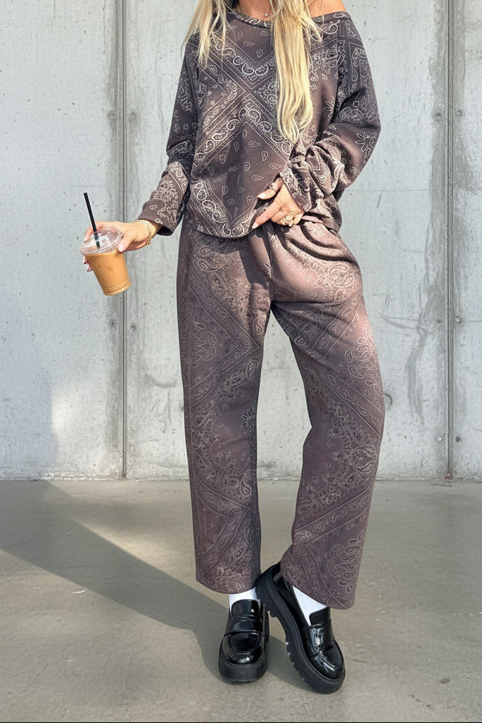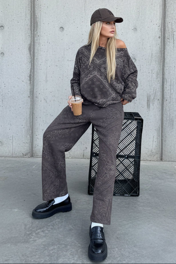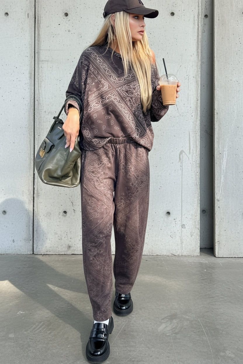 מכנס טרנינג דגם בנדנה בגזרה משוחררת ונינוחה, עם הדפס בנדנה ייחודי לכל האורך לווייב אורבני ושיקי.