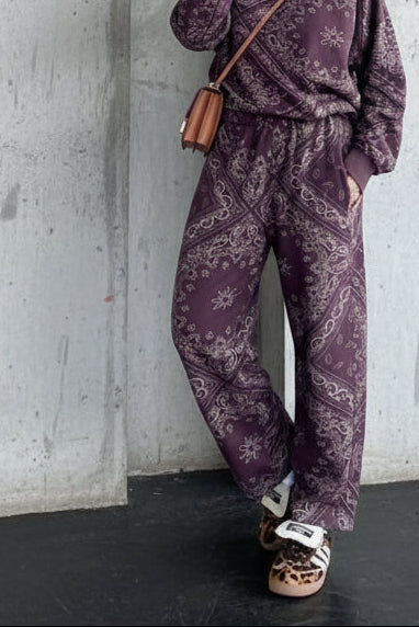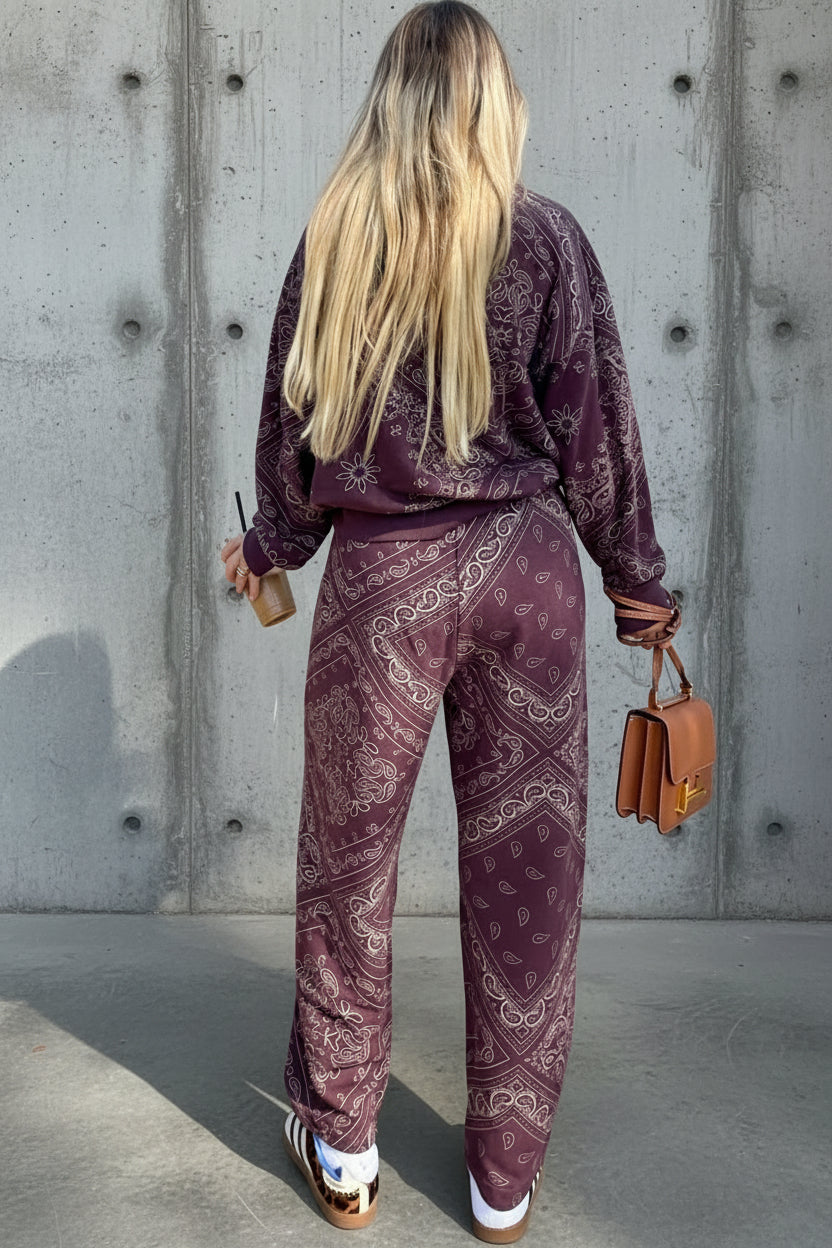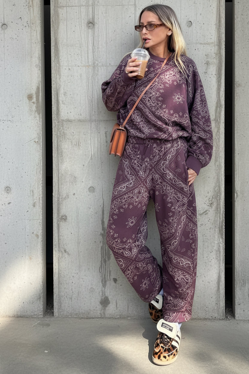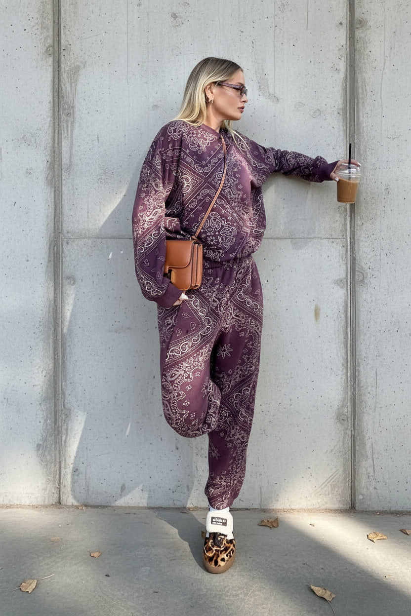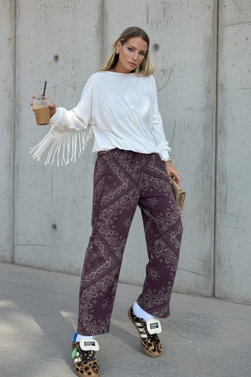 מכנס טרנינג דגם בנדנה גוון בורדו בגזרה משוחררת ונינוחה, עם הדפס בנדנה ייחודי לכל האורך לווייב אורבני ושיקי.