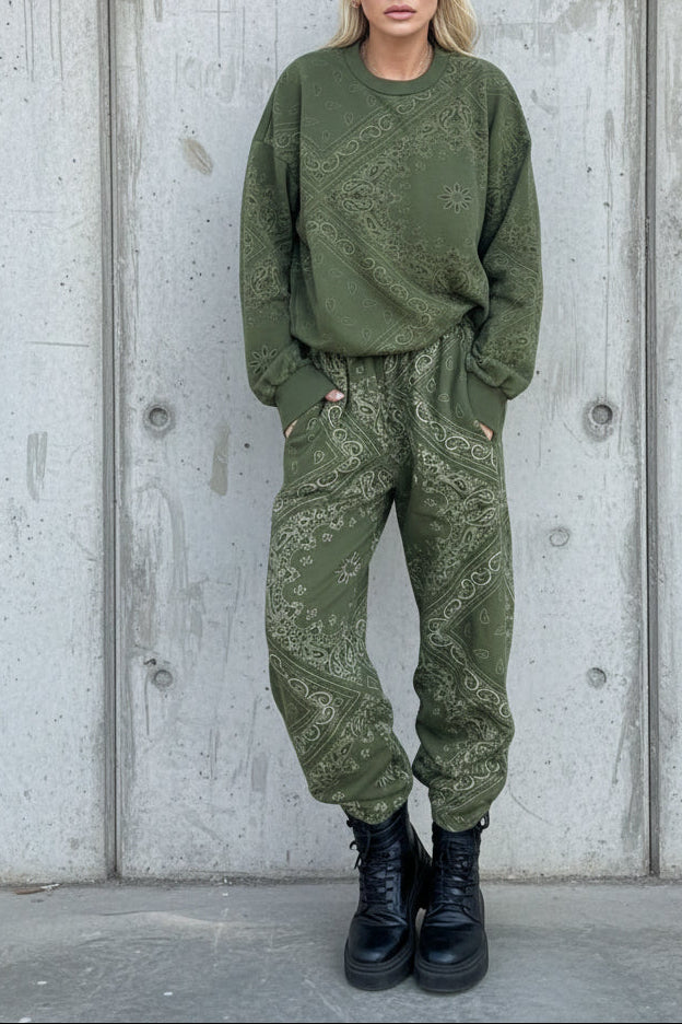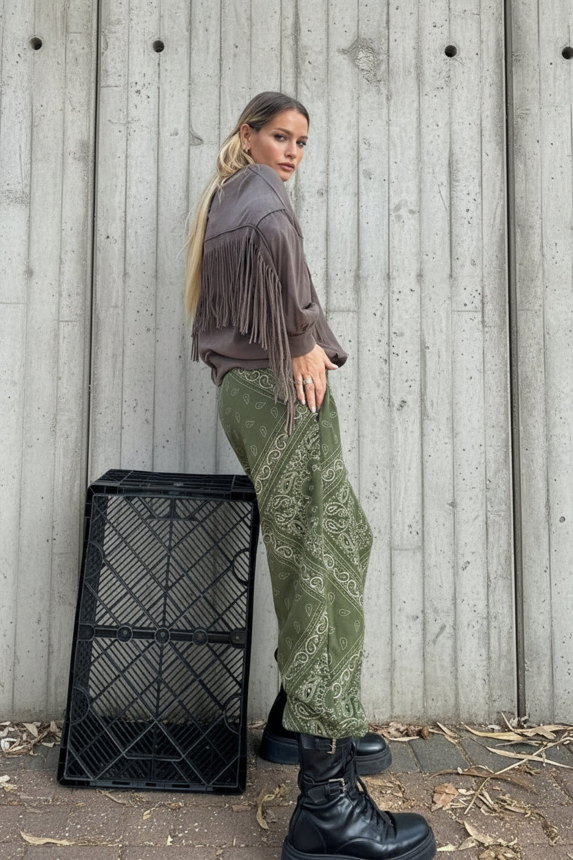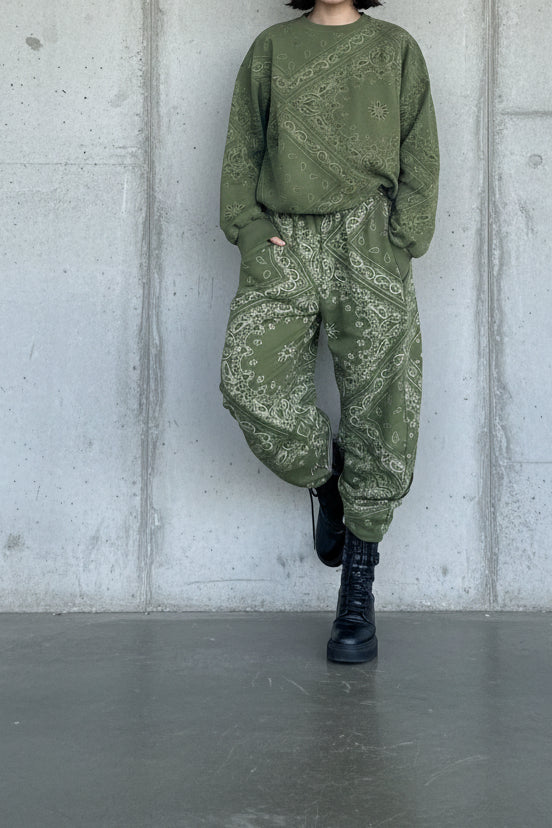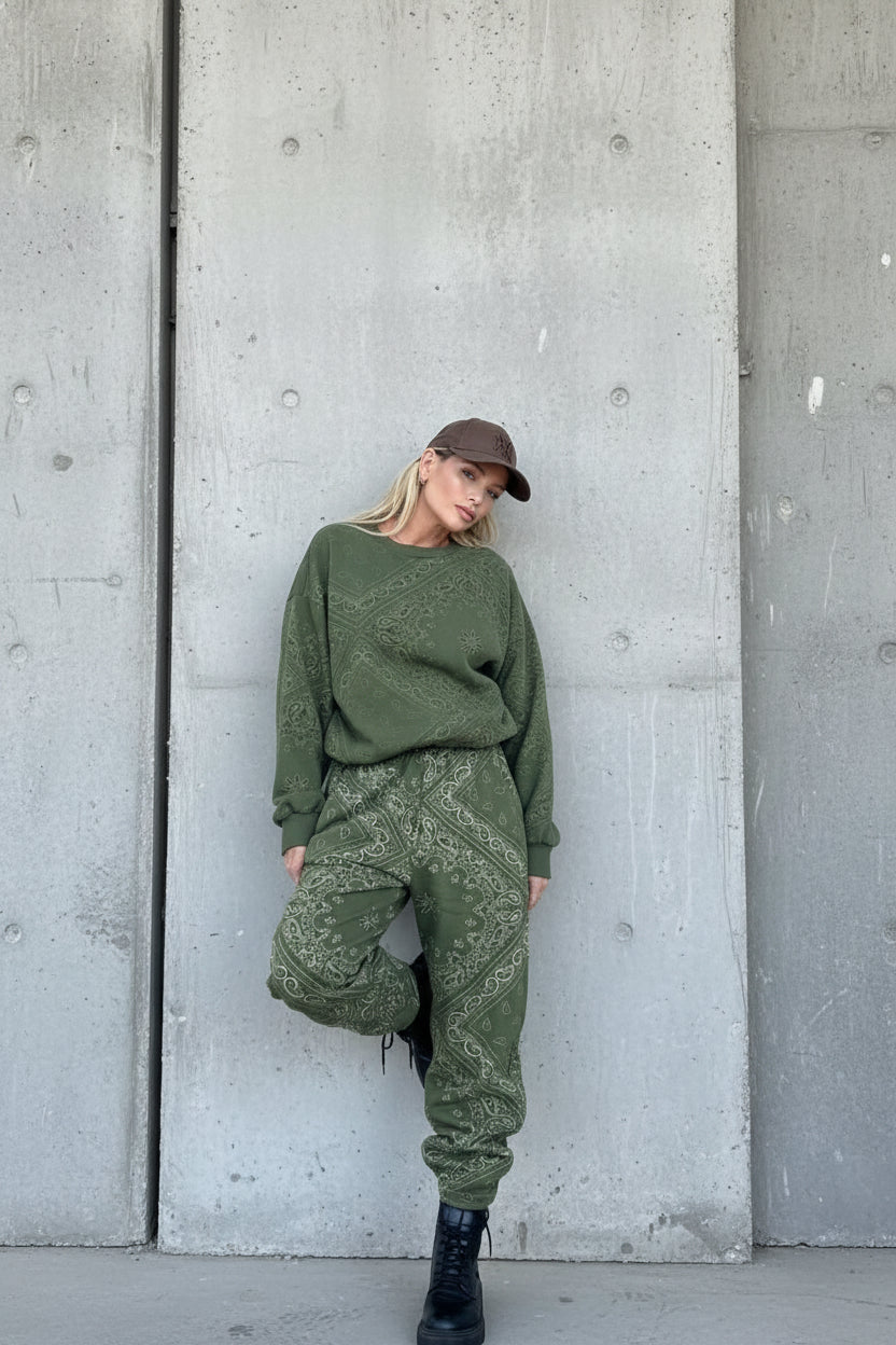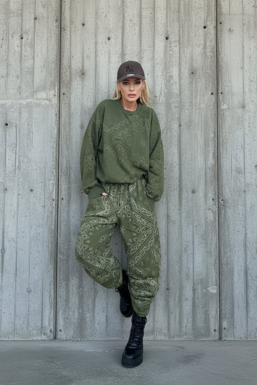 מכנס טרנינג דגם בנדנה גוון בורדו בגזרה משוחררת ונינוחה, עם הדפס בנדנה ייחודי לכל האורך לווייב אורבני ושיקי.