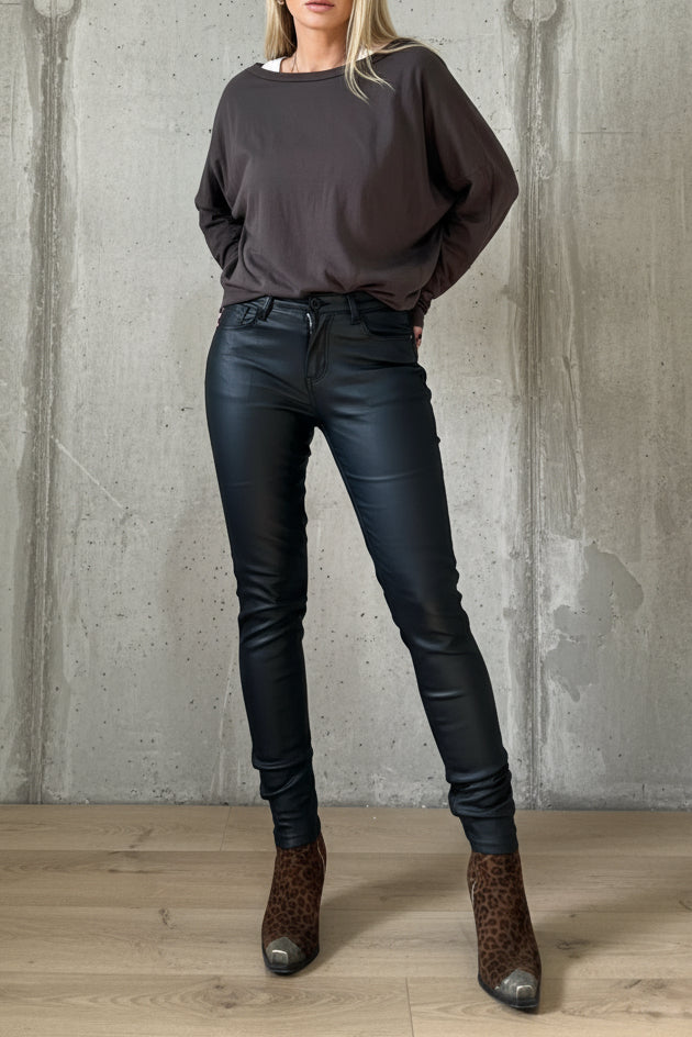 מכנס אלגנטי ומעודכן בגזרת סקיני מחטבת, עשוי מבד סיליקון ייחודי במראה מבריק ועדין. הבד האלסטי מעניק תחושת נוחות וגמישות מקסימלית לצד מראה יוקרתי וחלק. גזרה צמודה לאורך הרגליים שמדגישה את הסילואט, עם מראה שמתאים גם ליום־יום עם טי שירט קלילה וגם לערב עם עקבים וחולצה מתוחכמת