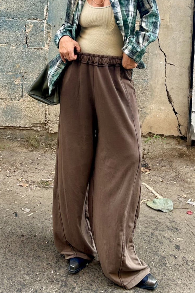 מכנס טרנינג בגוון חום מוקה בגזרה משוחררת ונינוחה, מבד נעים עם ברק עדין שמעניק מראה אלגנטי ולא מתאמץ.
