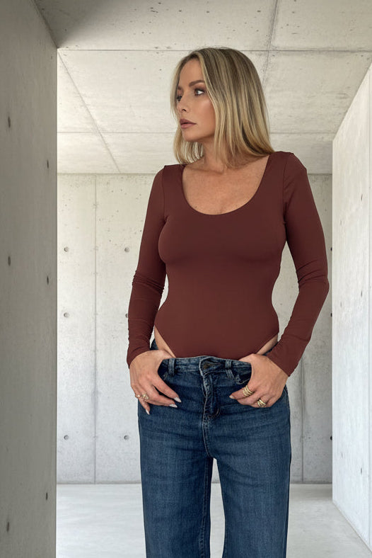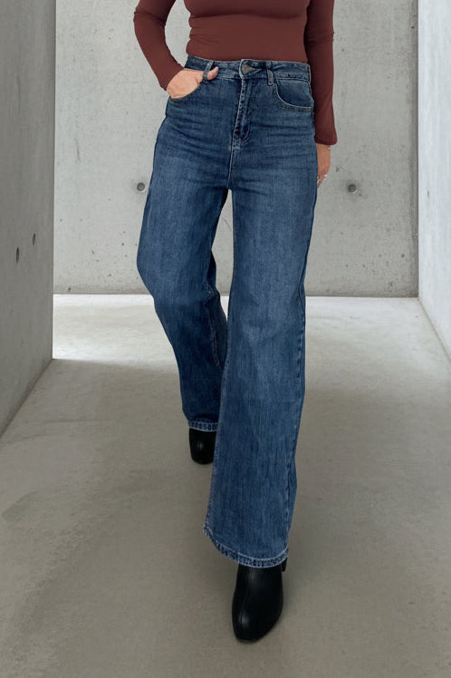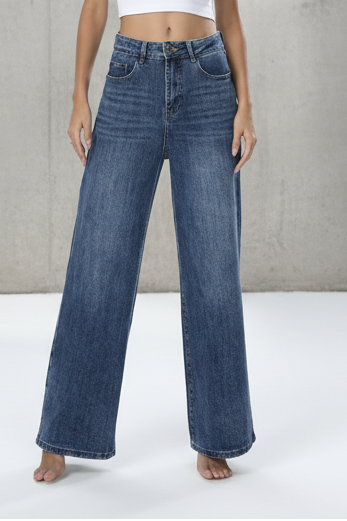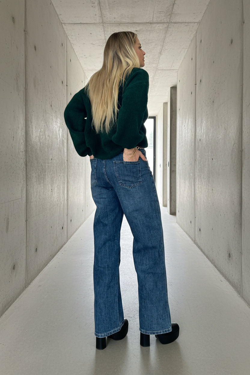 ג’ינס בגזרת מותן גבוהה עם רגל ישרה-רחבה, יוצר מראה מחמיא, ארוך ומדויק.
