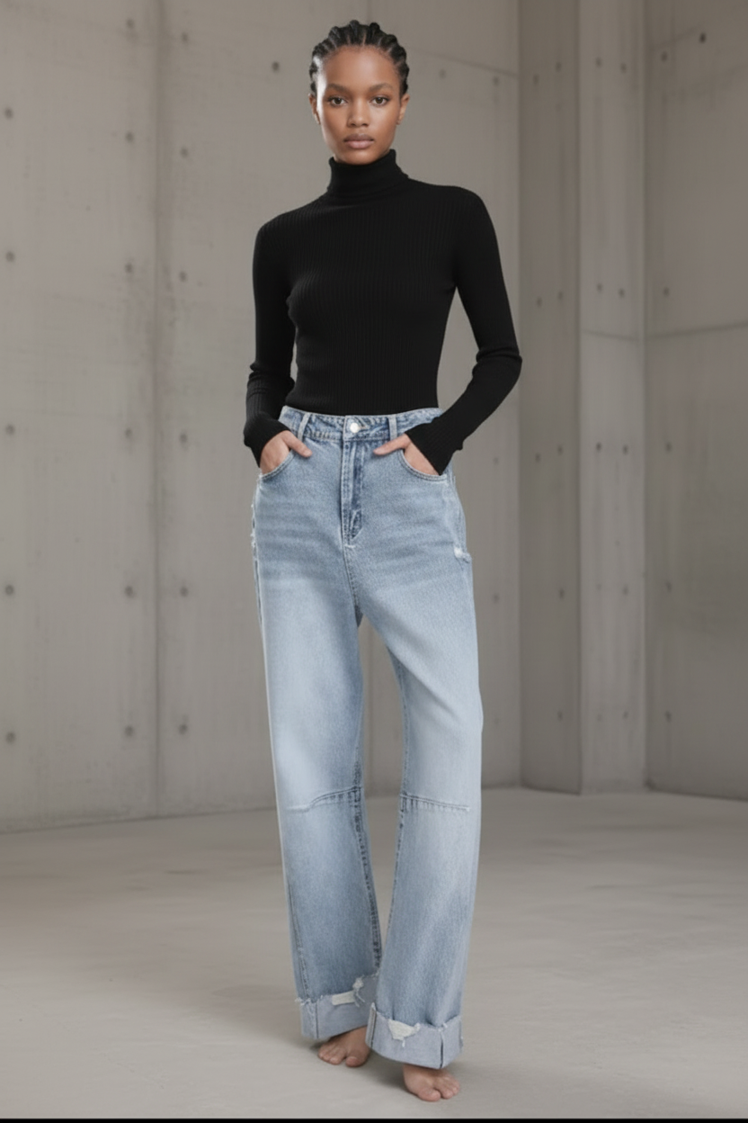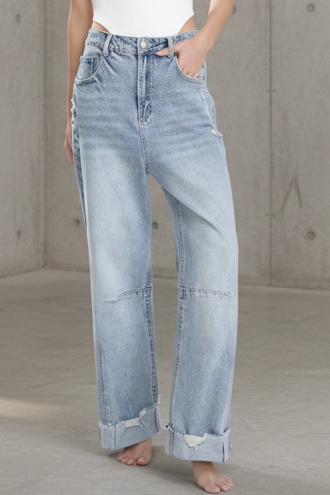 גימור ווש בהיר עם אפקט שחיקה טבעי, וקיפול מכפלת טרנדי שמוסיף אופי וסטייל.