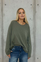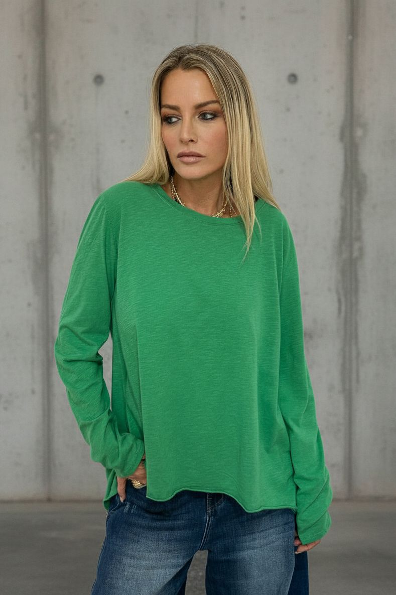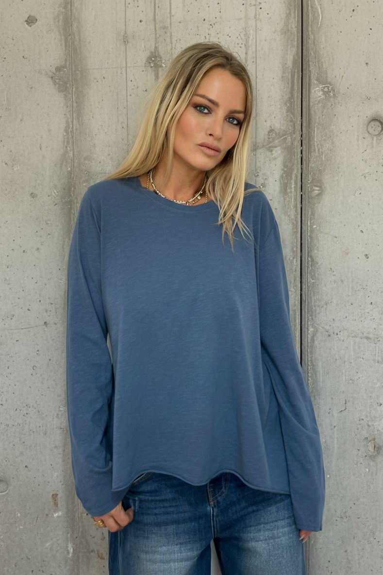טי שירט ארוכת שרוול בגזרת אוברסייז משוחררת, עשויה מ־100% כותנה רכה ונעימה למגע.