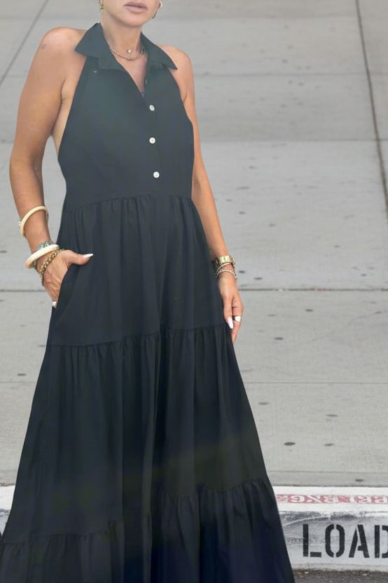 שמלת מקסי שחורה בסגנון effortless chic, עם גזרה מחמיאה ונשית. חלקה העליון מעוצב עם צווארון מחודד וכפתורים בחזית ליצירת מראה קז’ואלי-אלגנטי, והחצאית בנויה משכבות רחבות ונשפכות המעניקות תנועה ורכות. השמלה מגיעה עם כיסים צדדיים לנוחות מירבית ומשדרת שילוב מושלם בין נינוחות יומיומית לסטייל מוקפד