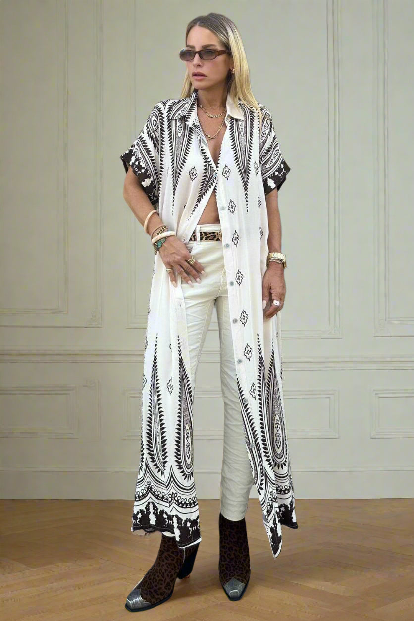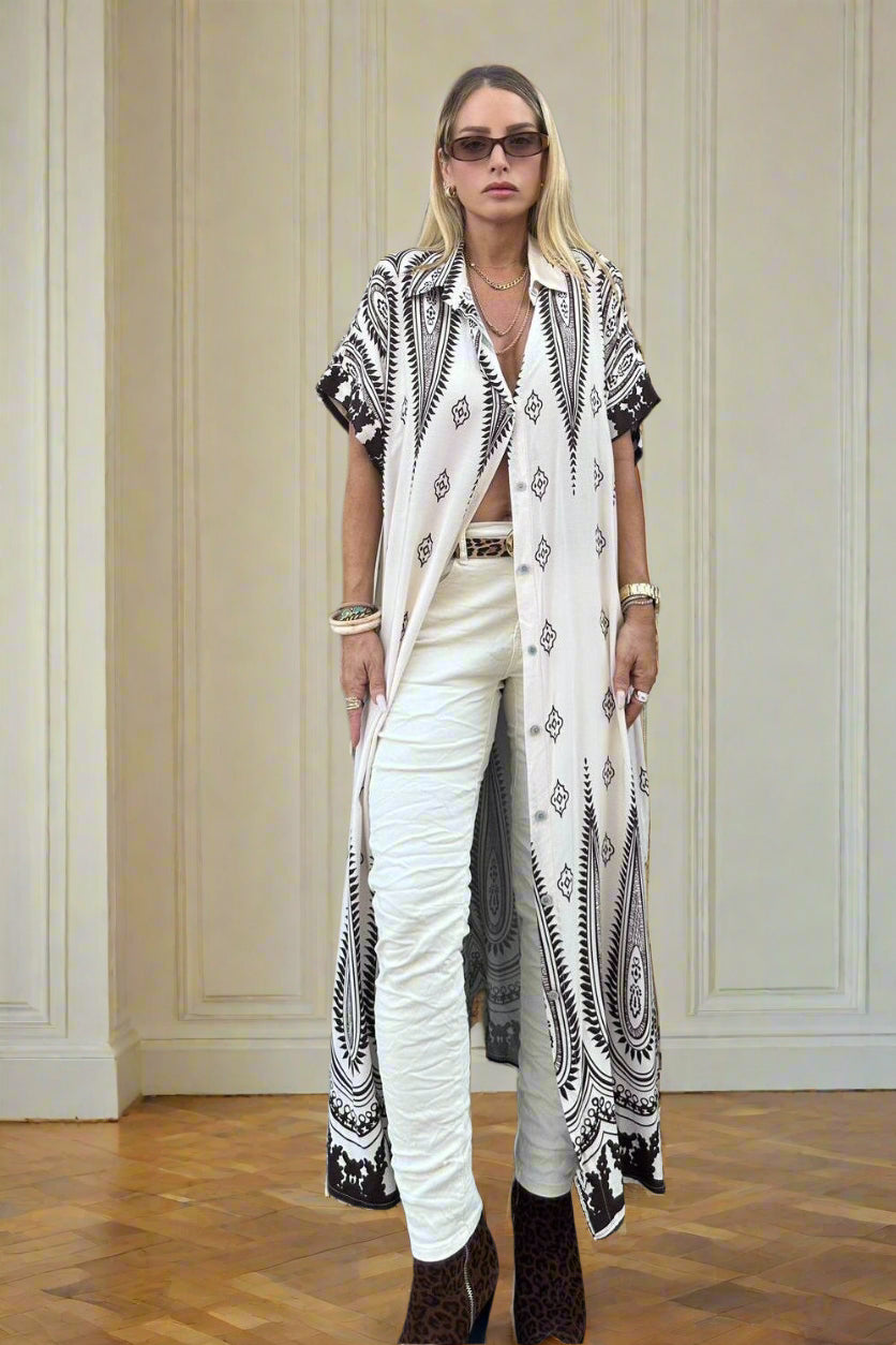 עשויה בד בהיר עם הדפס שחור גיאומטרי־אתני לאורך כל הגזרה. נופלת ברכות עד הקרסוליים עם פתיחה קדמית שמאפשרת משחק בין ללבוש אותה סגורה כחולצה ארוכה לבין לזרום איתה כעליונית. נלבשה כאן עם מכנס בגוון אוף־וויט מחטב ומגפוני נמר להשלמת לוק מלא נוכחות. שילוב של קלאסיות נינוחה עם טאצ’ נועז ואורבני