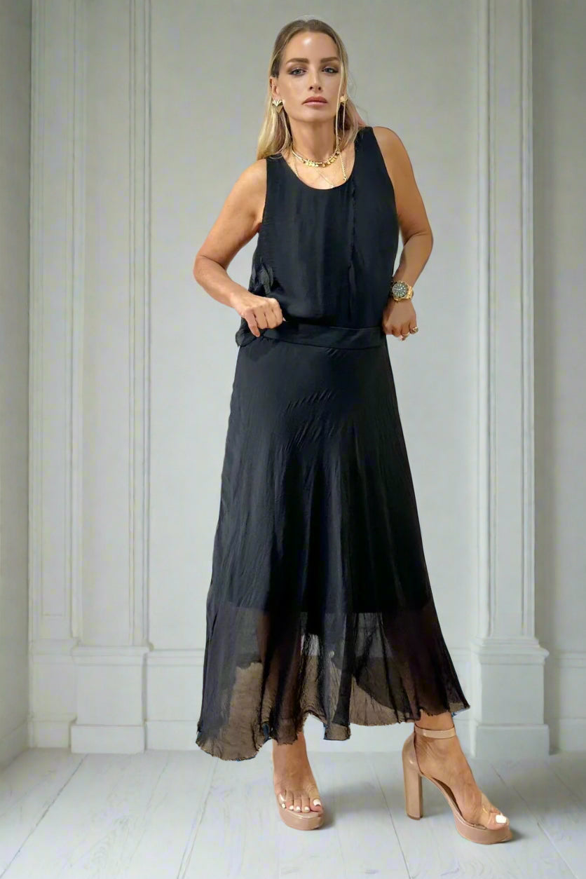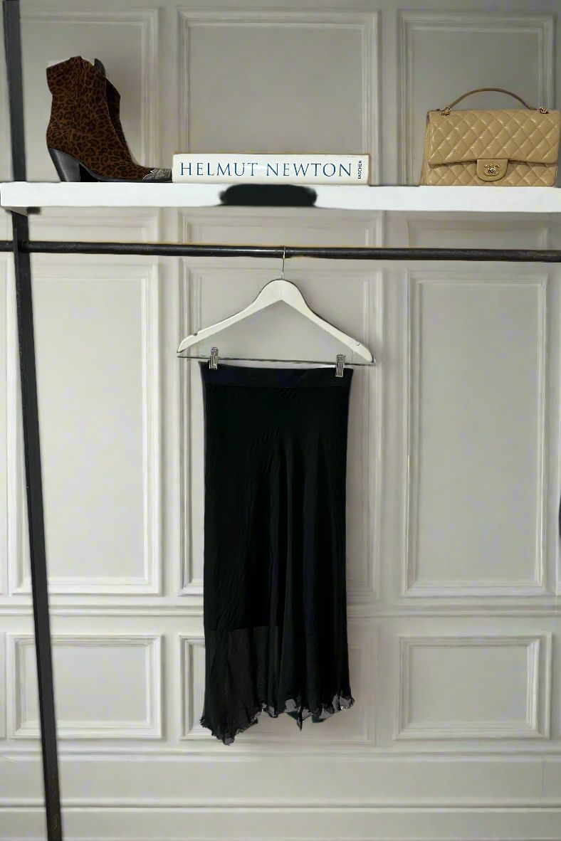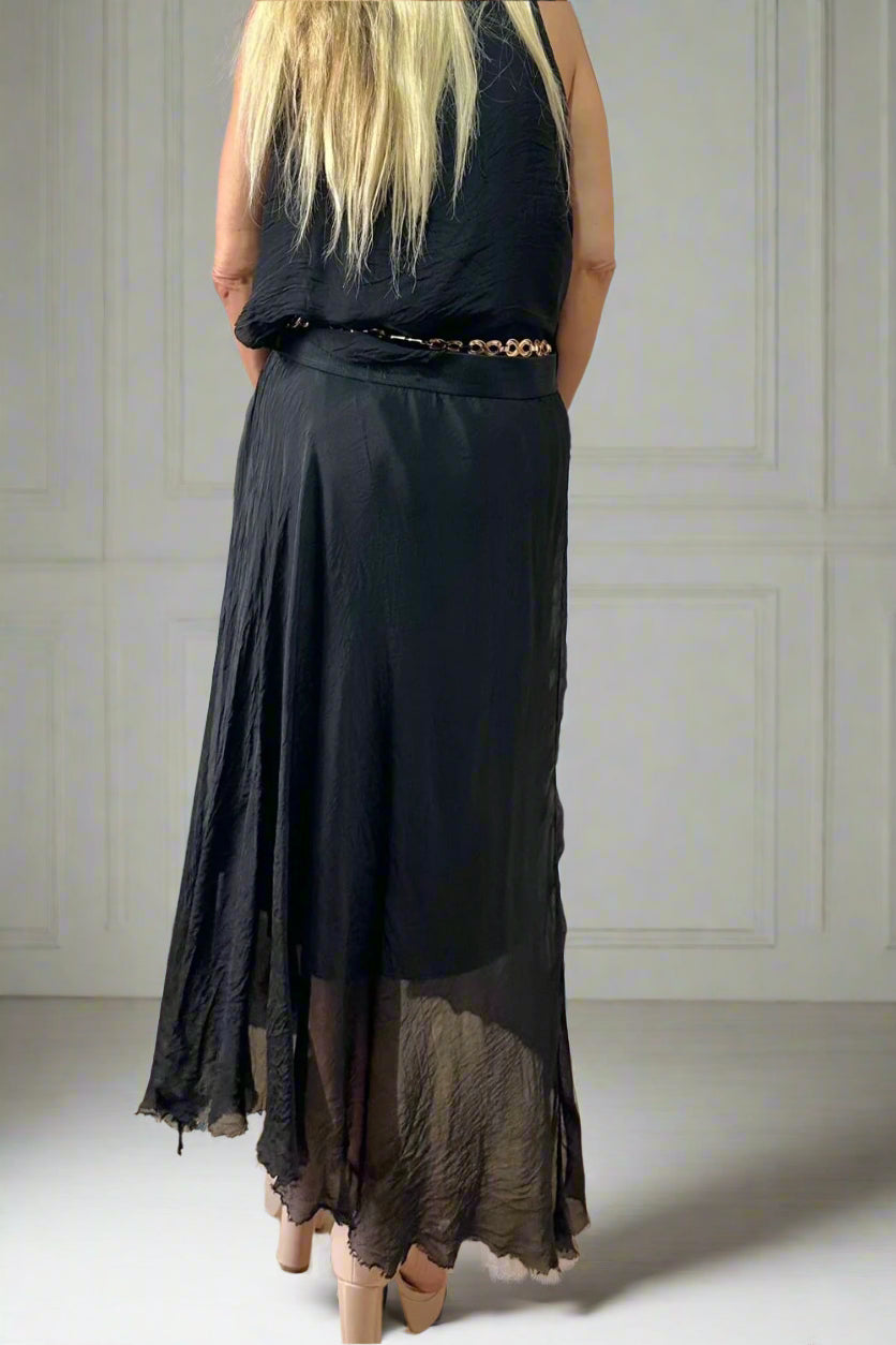 חצאית אסימטרית מבד משי קליל ונשפך, בגזרה מתרחבת שמעניקה מראה אלגנטי אך נינוח.