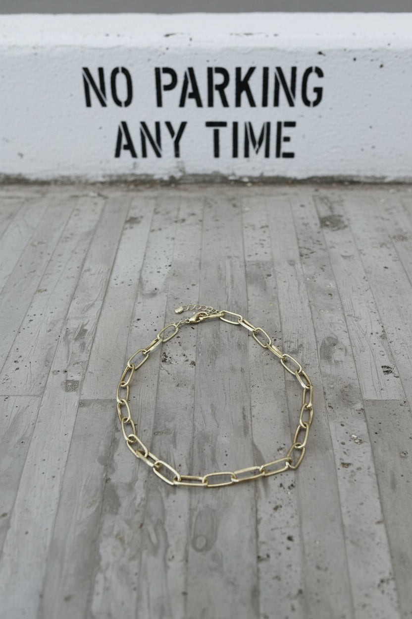 שרשרת חוליות מוזהבת בגזרה נקייה ומדויקת, עשויה חוליות אובליות גדולות במראה מודרני ואלגנטי.