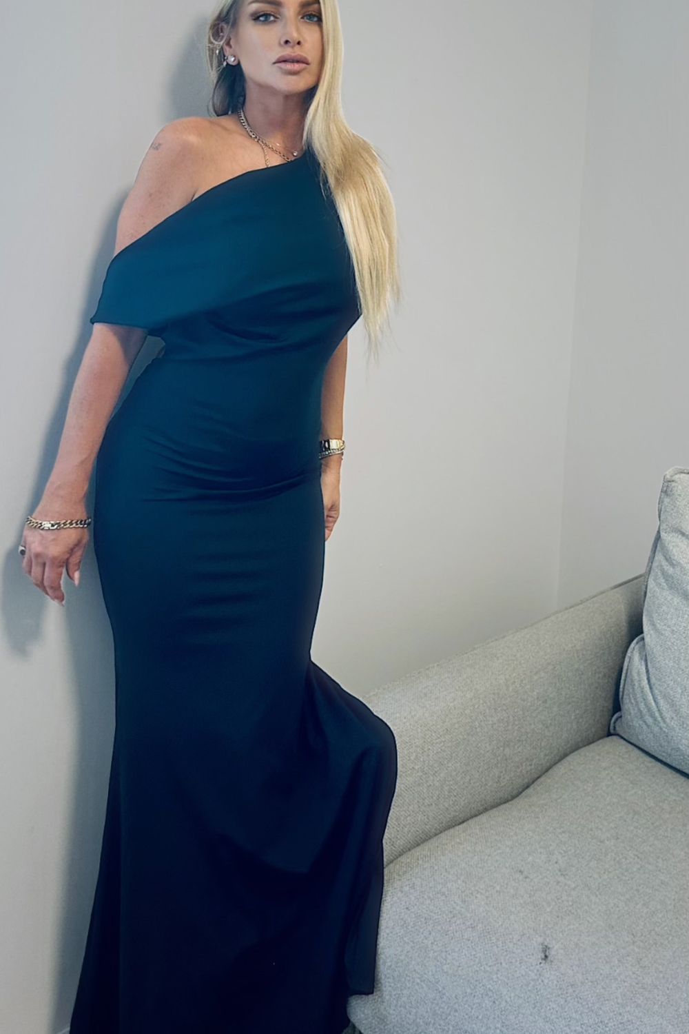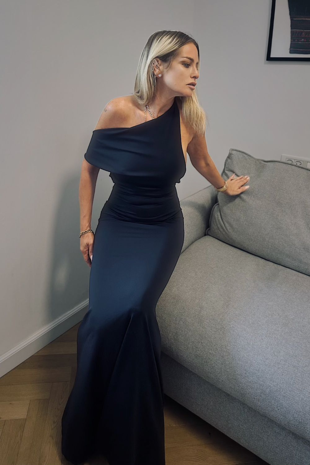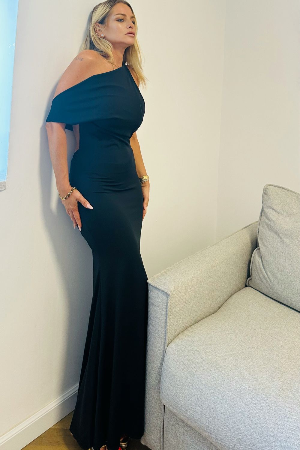 שמלת מקסי שחורה עוצרת נשימה, בגזרה שמחבקת את הגוף ומשתפלת באלגנטיות . החלק העליון בעיצוב א-סימטרי עם כתף אחת חשופה, שמעניק לשמלה מראה דרמטי ומתוחכם. הגב פתוח וחושף את הכתפיים והגב העליון עם רצועות דקות שמוסיפות טוויסט חושני ומודרני. עשויה מבד נעים ונשפך שמחמיא לקימורי הגוף ויוצרת סילואטה זורמת ומרשימה. מושלמת לאירועים חגיגיים ולערבים שבהם את רוצה לגנוב את ההצגה