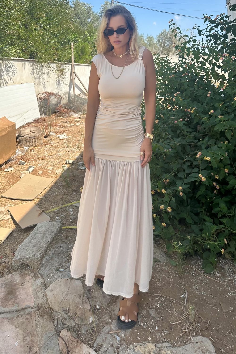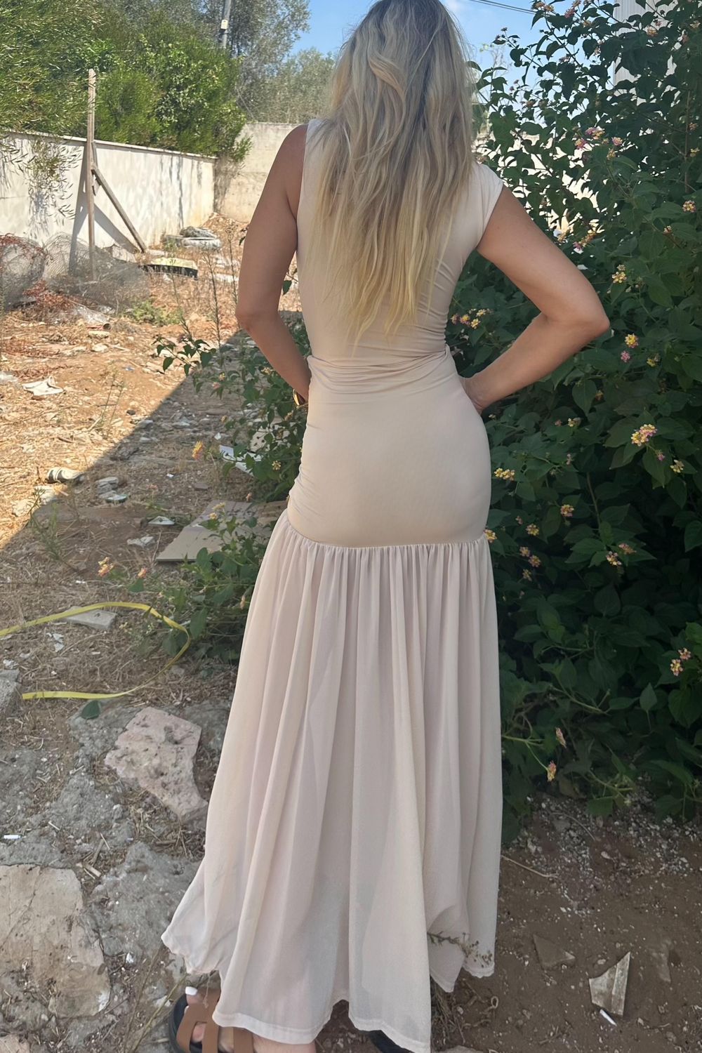 שמלת מקסי אלגנטית מבד רך וקליל, שנשפך ומחמיא בתנועה. חלקה העליון צמוד ומעוצב עם כיווצים עדינים ליצירת גזרה מחמיאה, וממנו נפתח חיבור דרופ-וויסט אל חצאית שופעת ומלאת נוכחות. בגזרת שרוול קצר עם פרטי כתף עדינים, זו שמלה שמשלבת פשטות קלאסית עם תחכום עכשווי—מתאימה לאירועי יום וגם לערב