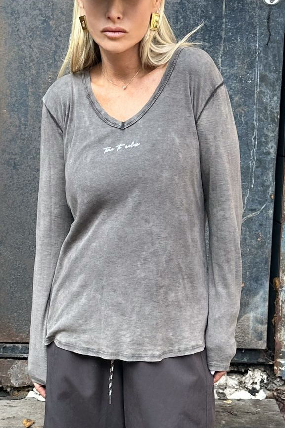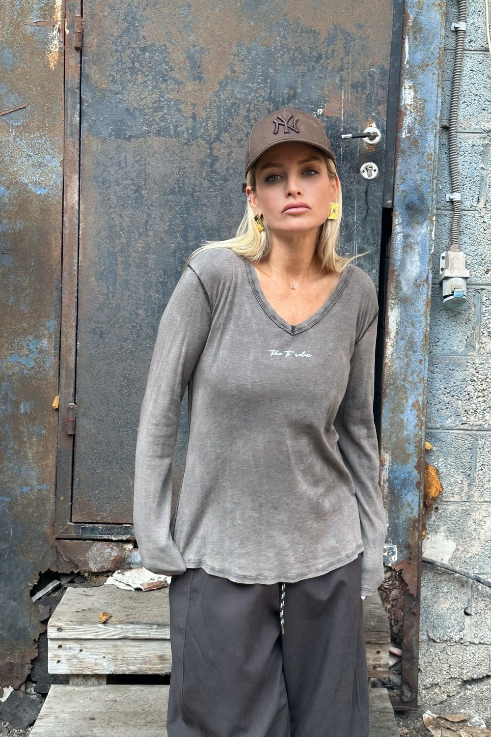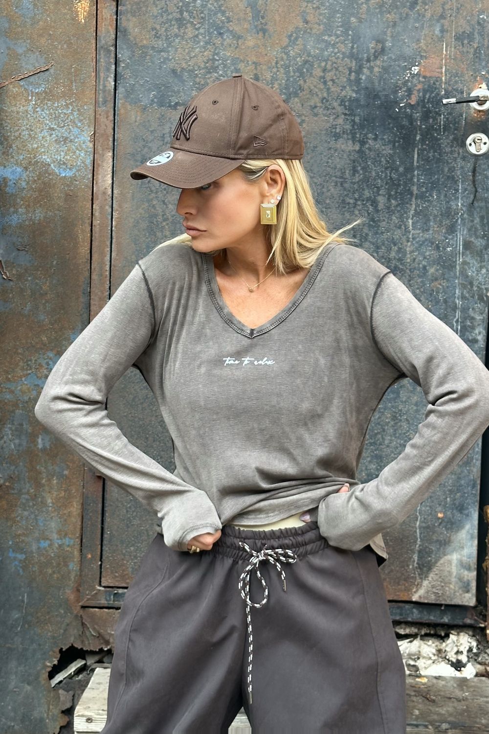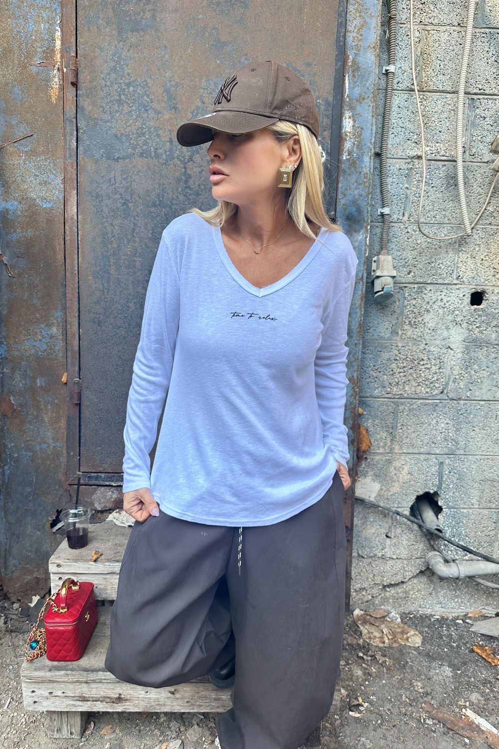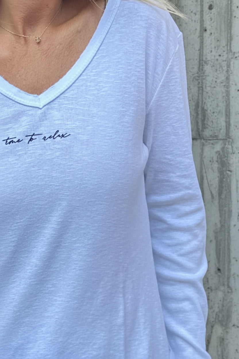 טי שירט ארוכה עם מחשוף וי עדין והדפס קטן מלפנים בגוון לבן