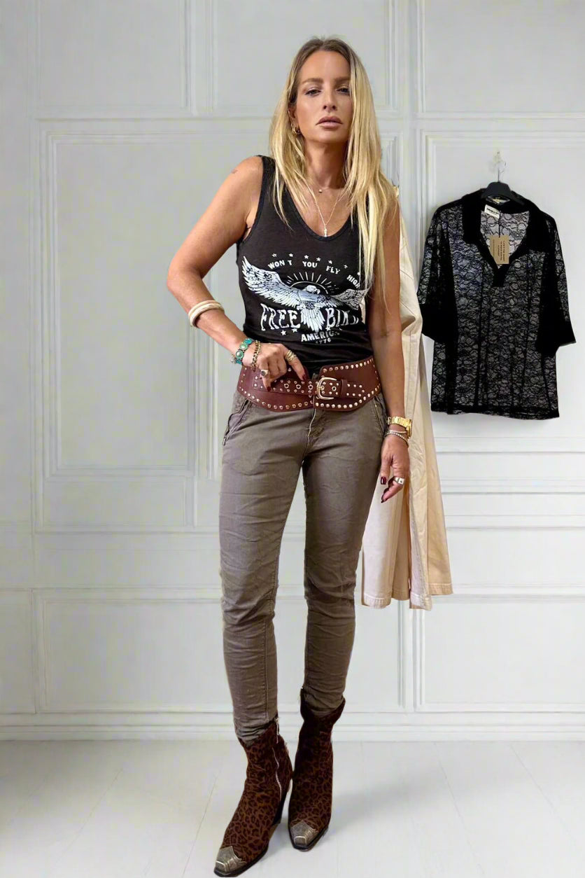 מכנס בגזרת סקיני גוןן חום מעושן,