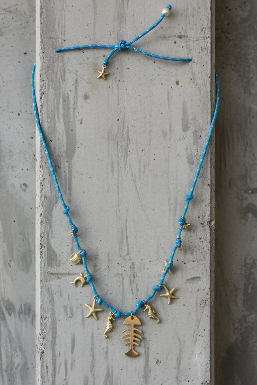 שרשרת חבל כחולה עם תליון מרכזי בצורת שלד דג מוזהב, ולצידו תליוני צדפים, סוסוני ים, כוכבי ים ודולפין. שילוב playful עם טאץ’ בוהמייני־קיצי, שמכניס וייב של חוף וים לכל לוק. פריט קליל, צבעוני ומלא חיים – מושלם לפסטיבלים, חופשות קיץ או כל יום שבו רוצים לשאת איתך קצת מהאוקיינוס