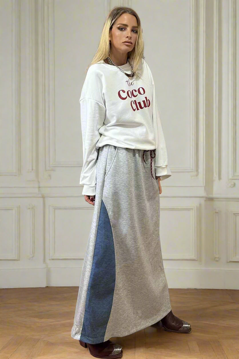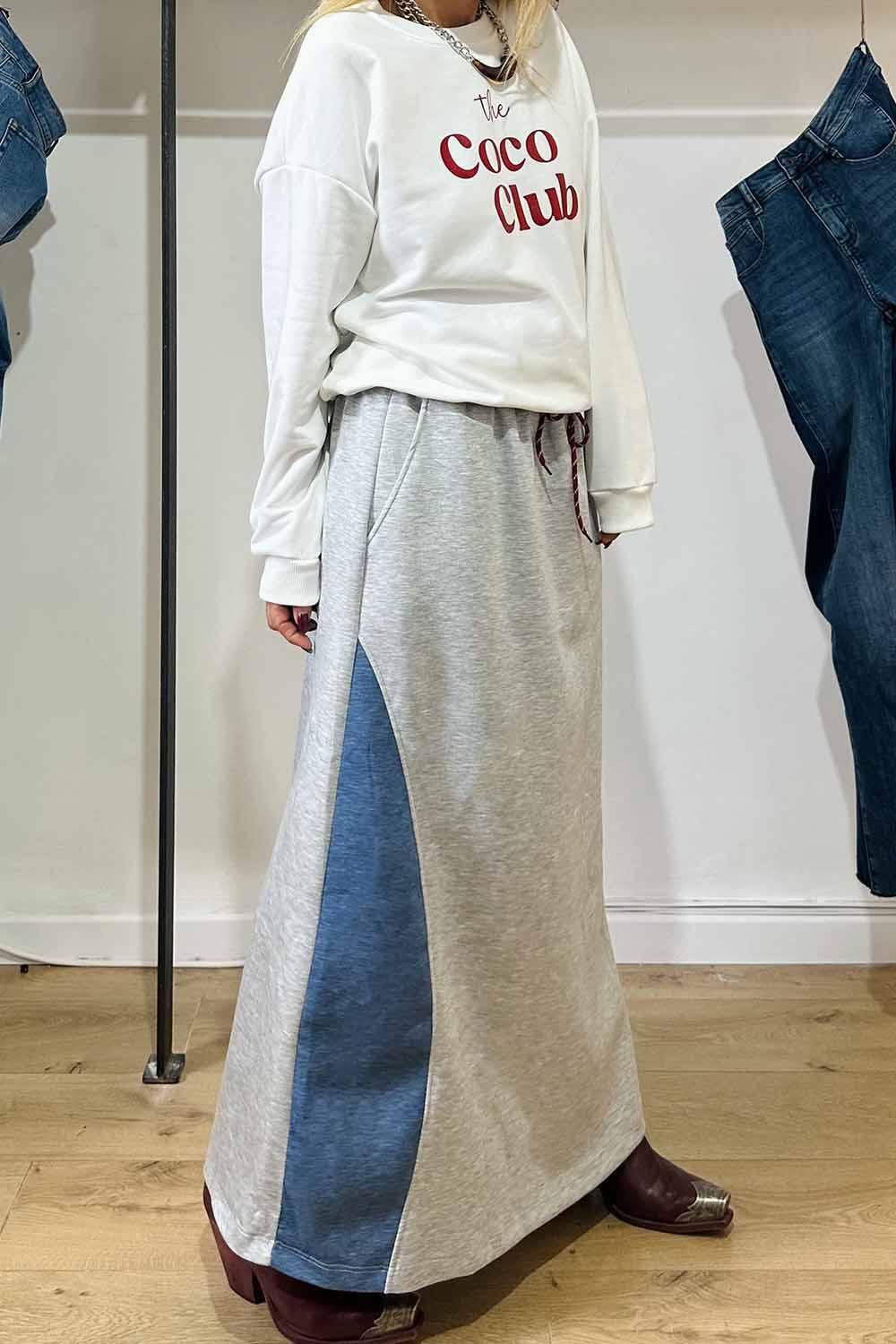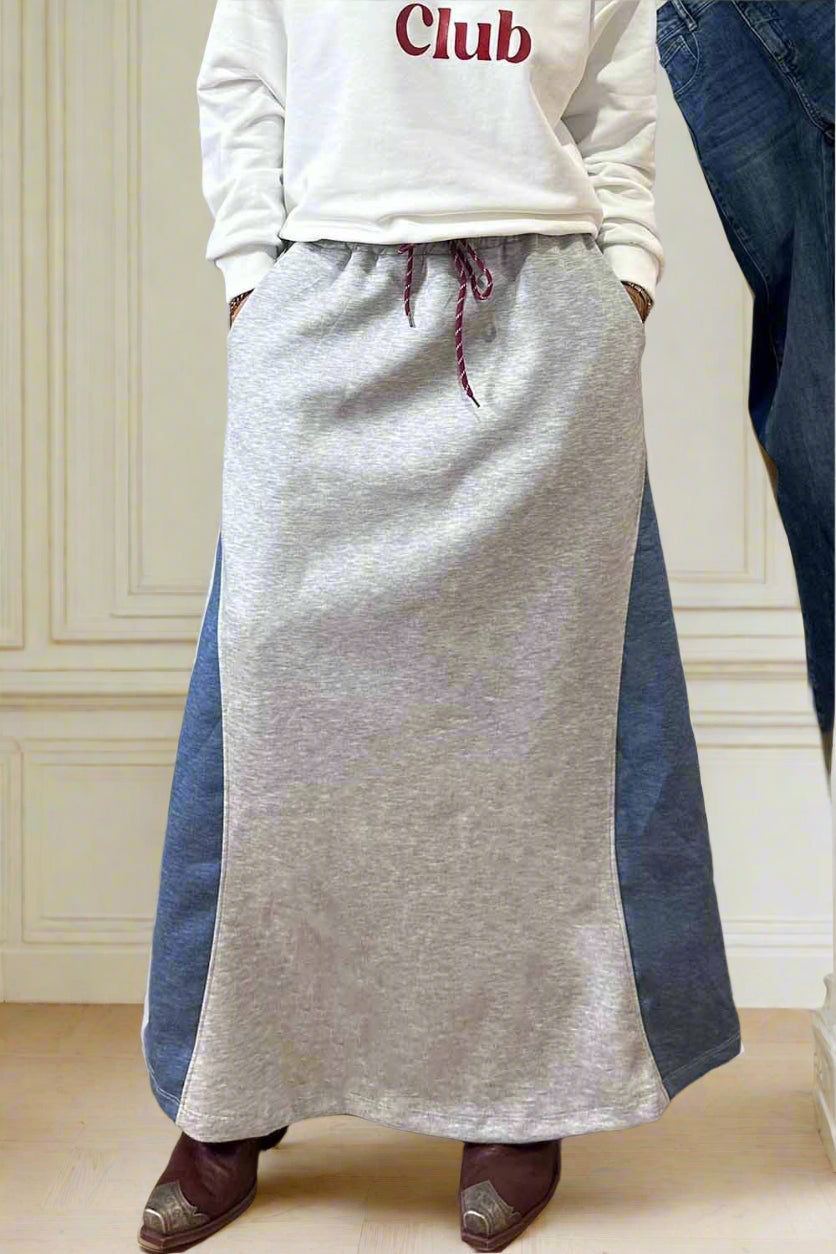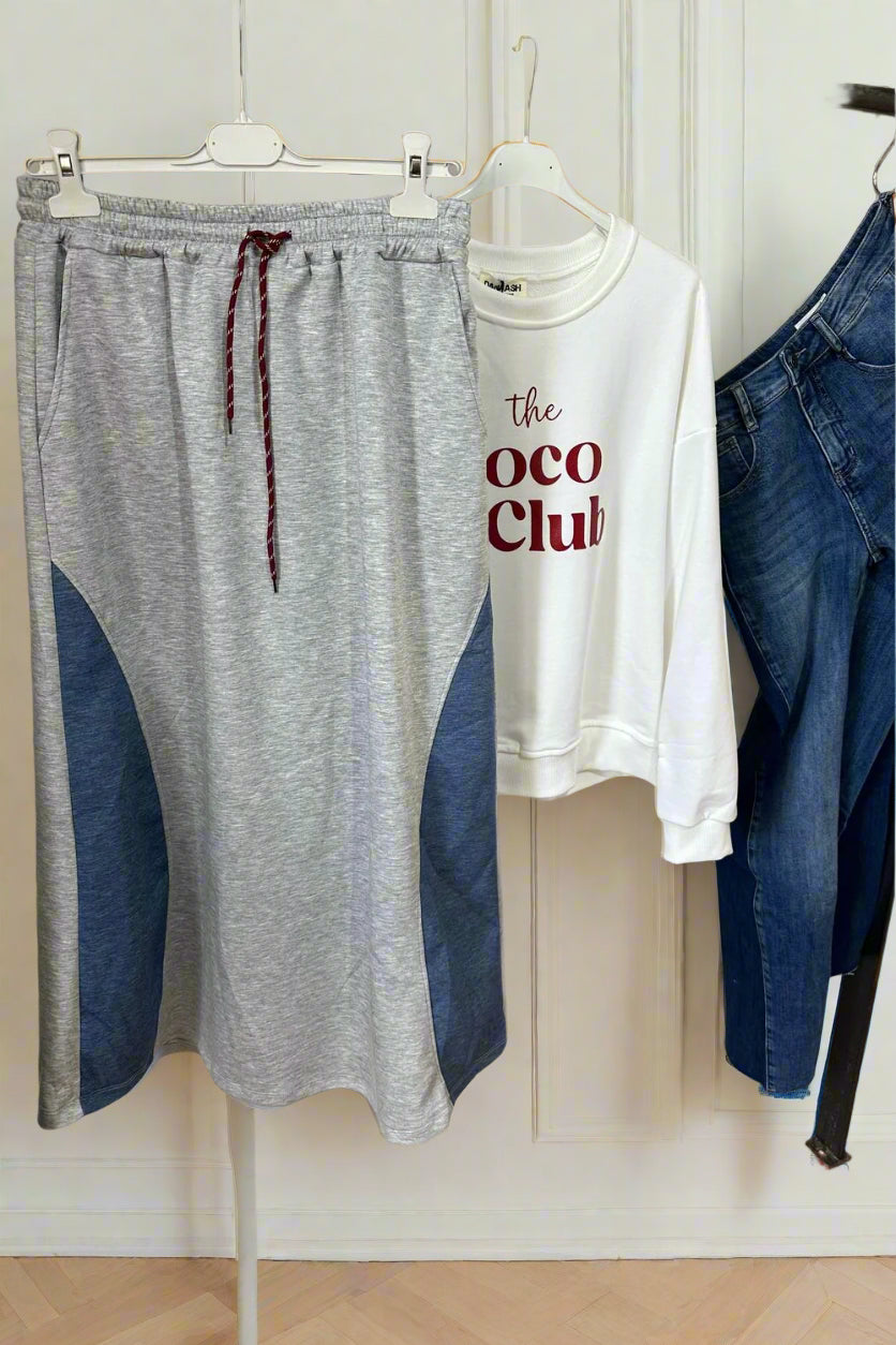 חצאית טריקו בסגנון קז’ואל ייחודי, בגזרת מקסי משוחררת ונוחה.
