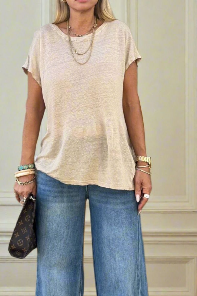 טי שירט פשתן בגוון טבעי, בגזרת אוברסייז משוחררת עם מפתח עגול ורכות נעימה שנשפכת על הגוף. הבד הקליל מעניק תחושת נינוחות וסטייל לא מתאמץ, כזה שמתאים גם ליום בעיר וגם לערב חמים על החוף. השרוולים הקצרים והגזרה המשוחררת יוצרים מראה עדכני, קליל ומלא שיק.