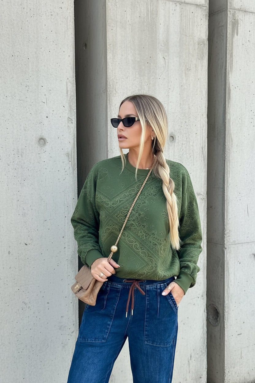 סווטשירט בנדנה אוברסייז גוון ירוק בגזרה משוחררת ומדויקת, עם הדפס בנדנה מלא שמשדר וייב אורבני מחוספס.