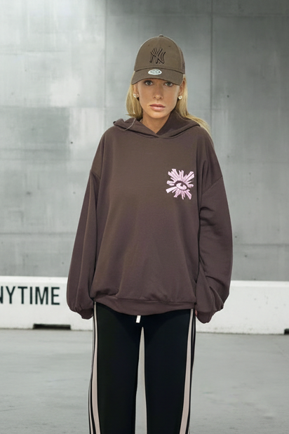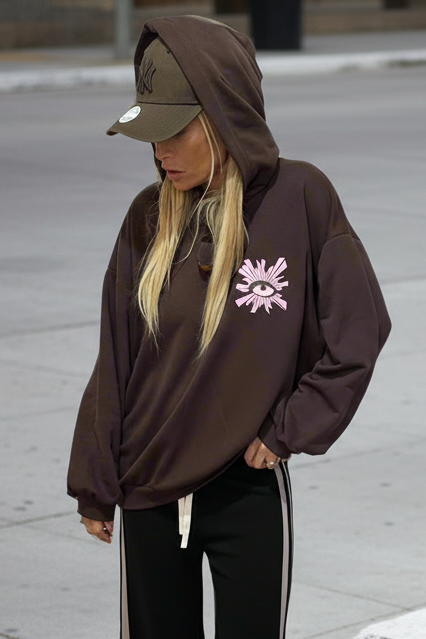 סוויטשרט אוברסייז מבד פליז רך ונעים, בגוון חום עמוק עם הדפס עין בגווני ורוד בייבי מלפנים ומאחור.