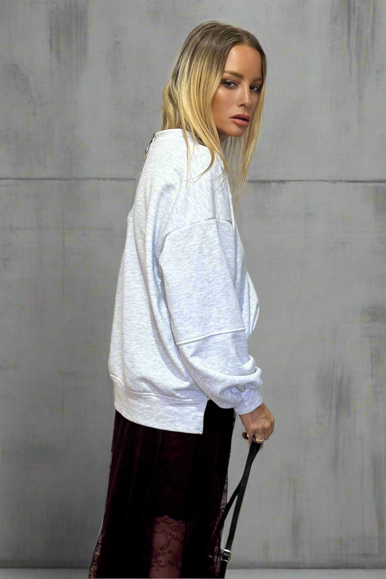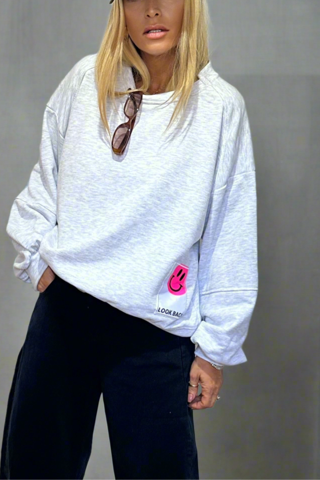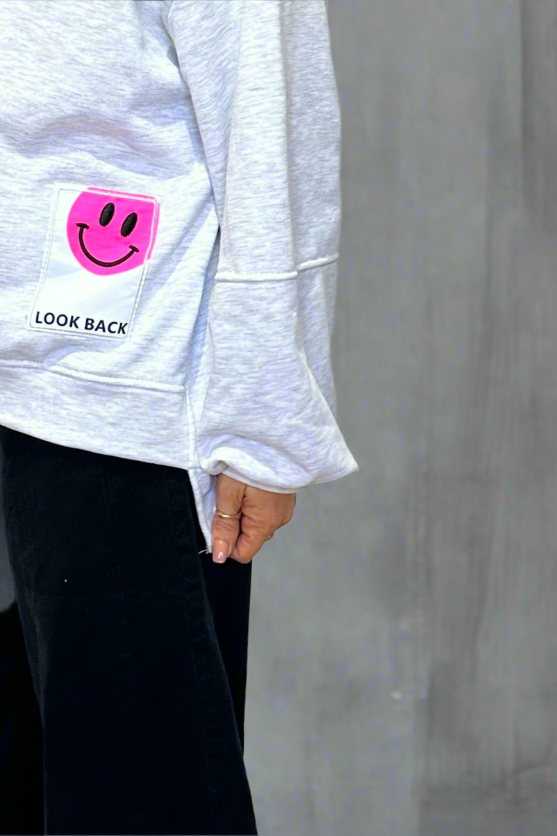 סווטשרט אוברסייז בגוון אפור מלנג’ רך, עם הדפס סמיילי קטן בצבע ורוד ניאון שמציץ מהצד — נגיעה שובבה בלוק נקי וקלאסי.