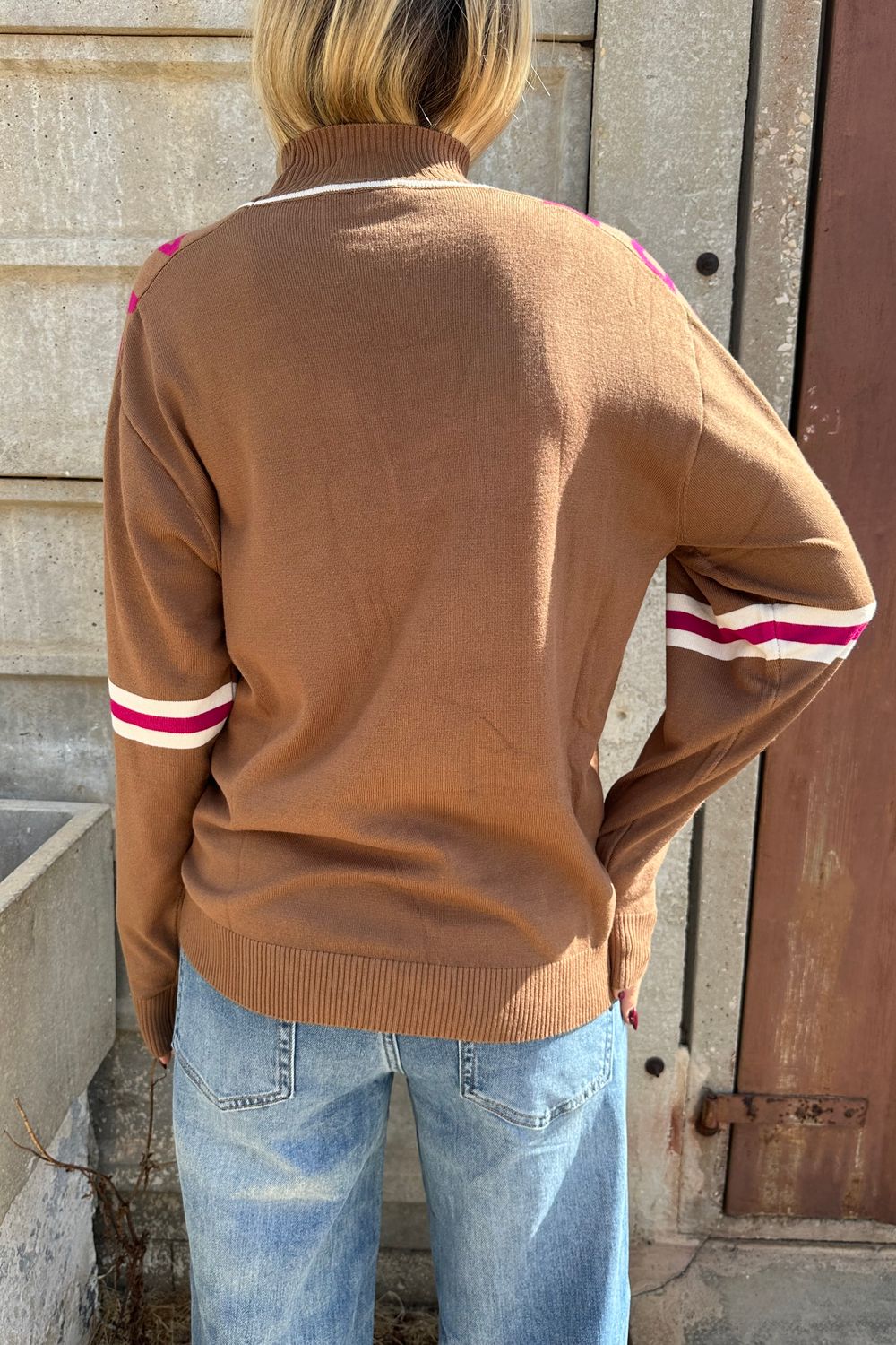 צווארון גבוה עם פסי צבע טרנדיים, וסיומות סרוגות ליישוב מושלם של המראה.