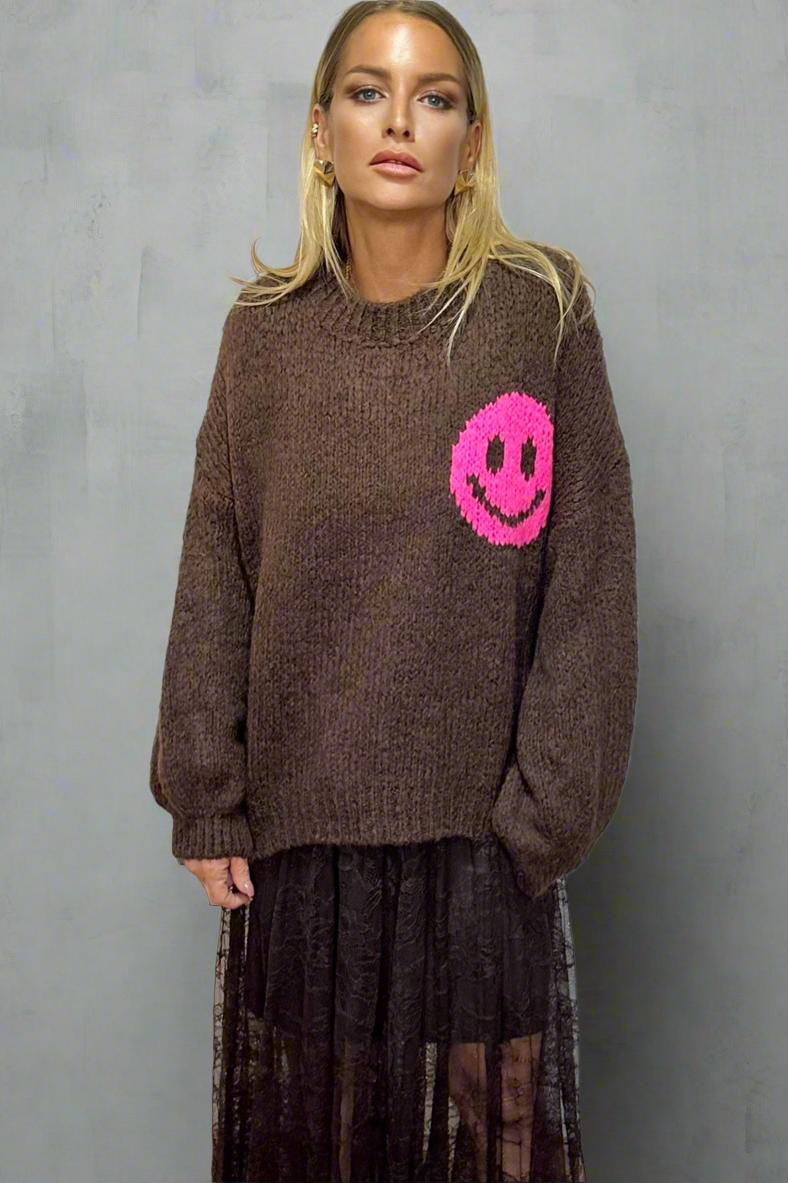 סריג אוברסייז רך ומחמם בגוון חום קפה, עם הדפס סמיילי גדול בצבע ורוד פלור המסמל שמחה ואנרגיה חיובית.