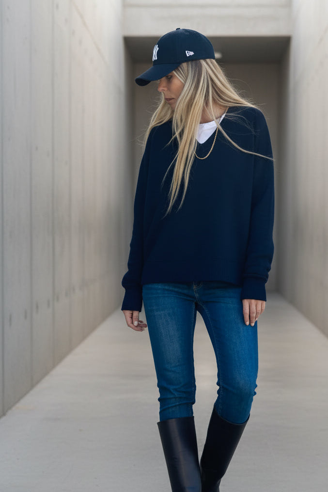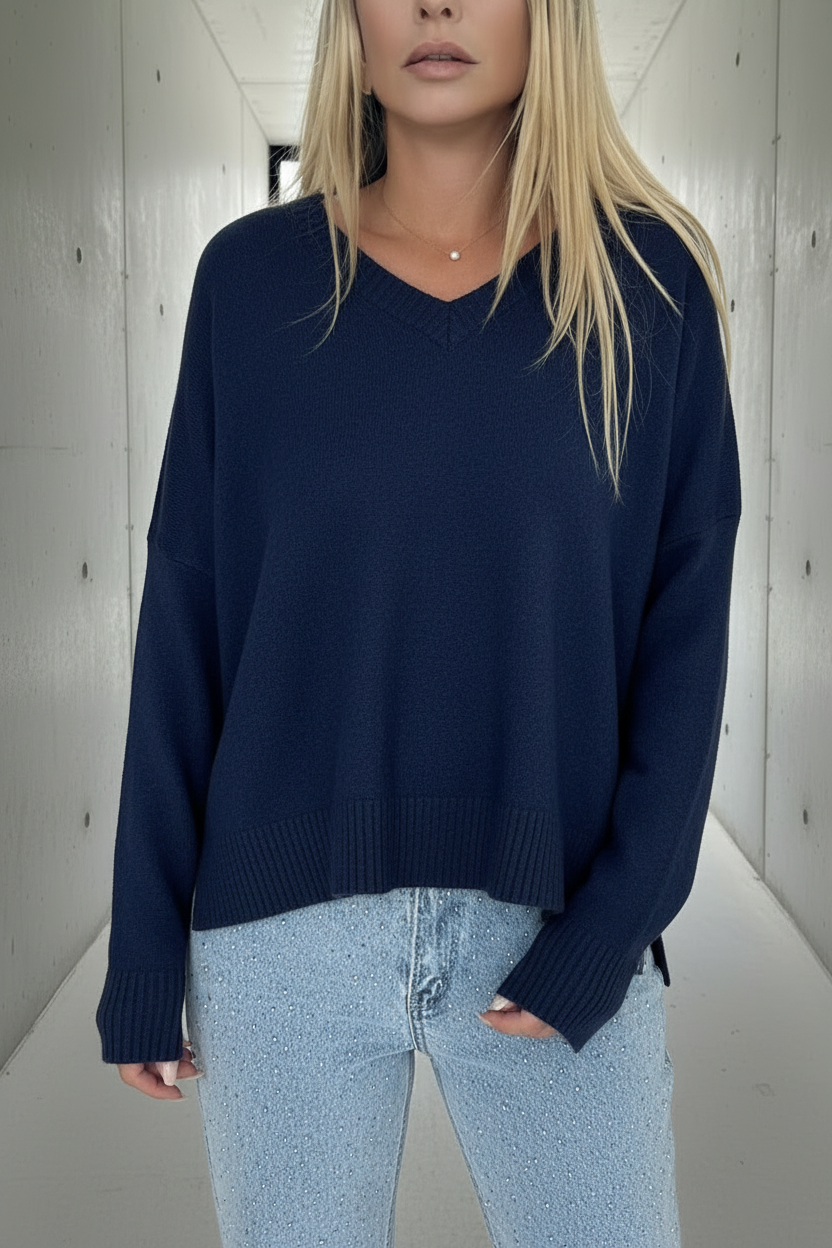 סריג רך ונעים למגע בגזרת אוברסייז v מחמיאה, עם נפילה טבעית ואלגנטית על הגוף.