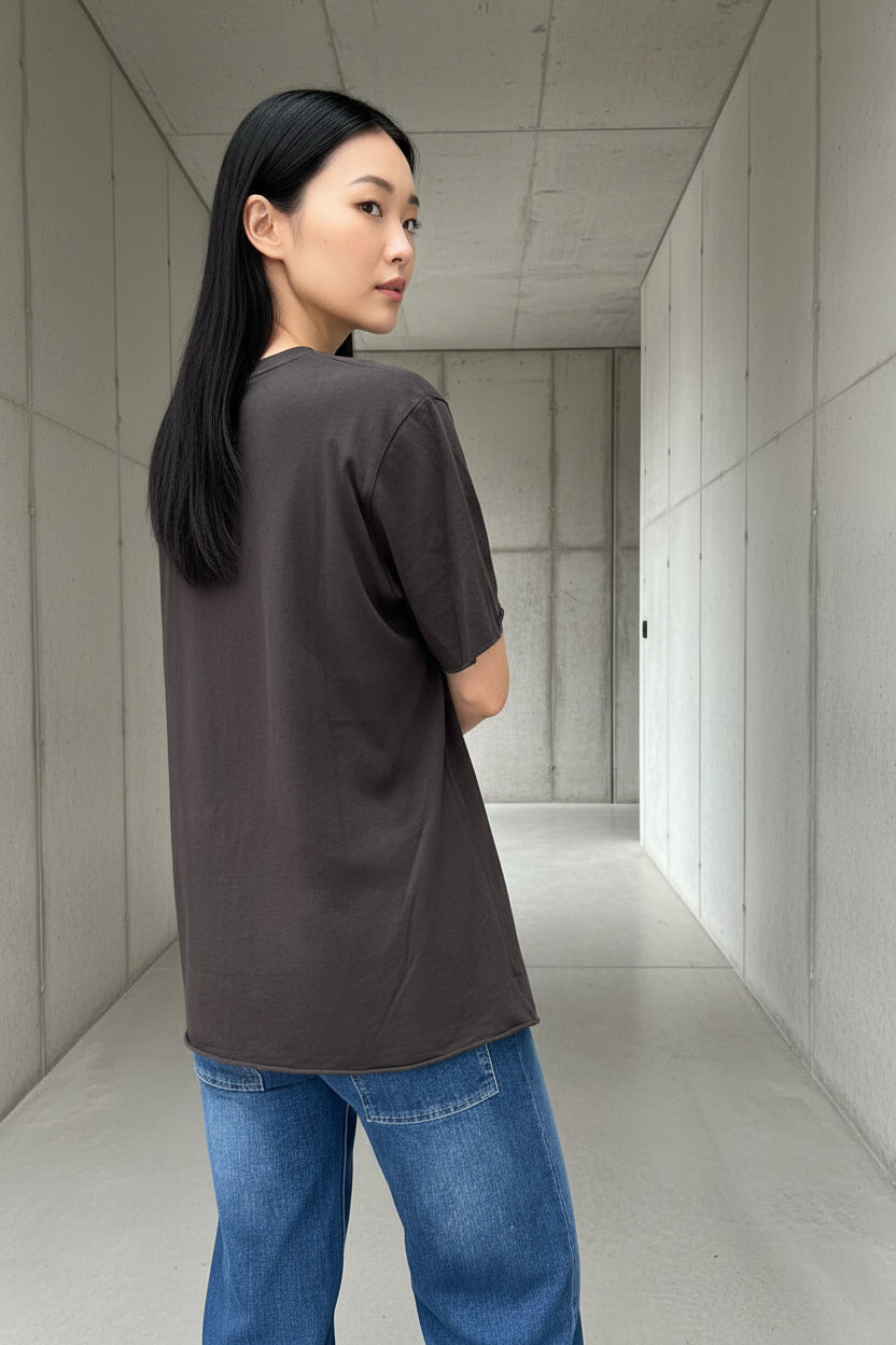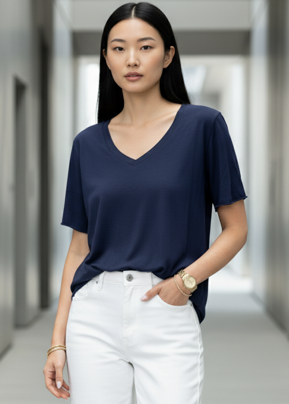 טי-שירט בייסיק חלקה בגזרת V נינוחה עם שרוול קצר. עשויה מבד כותנה קליל ורך למגע, מושלמת לשילוב יומיומי. מתאימה ללבישה בפני עצמה או כשכבת בסיס מתחת לז’קטים וסוודרים. זמינה במגוון צבעים עשירים ליצירת לוק מותאם אישית בכל עונה