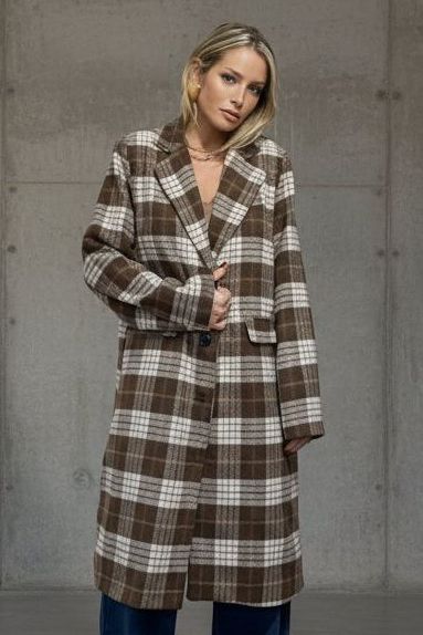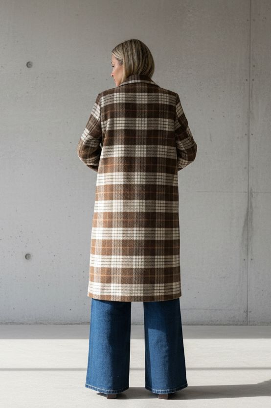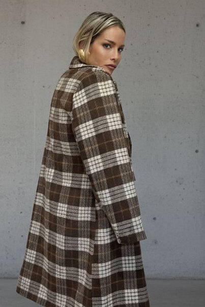 מעיל משובץ בעל מראה קלאסי ועל-זמני, בגזרה ישרה ומעט אוברסייז שמחמיאה לכל מבנה גוף. עשוי בד נעים וחמים במראה חורפי מושלם, עם דוגמת קוביות בגווני חום–שמנת שנותנת טאצ’ של אלגנטיות כפרית.