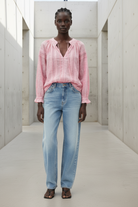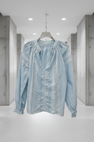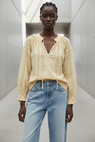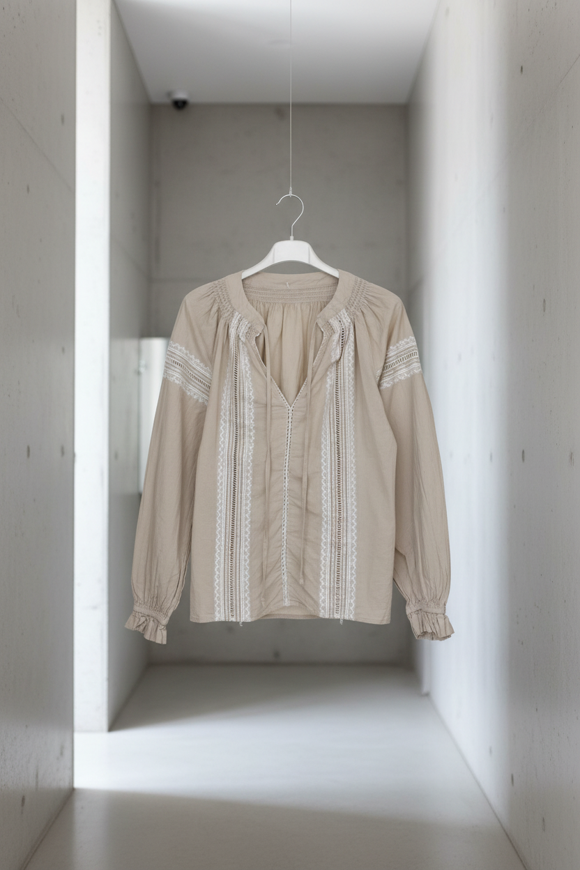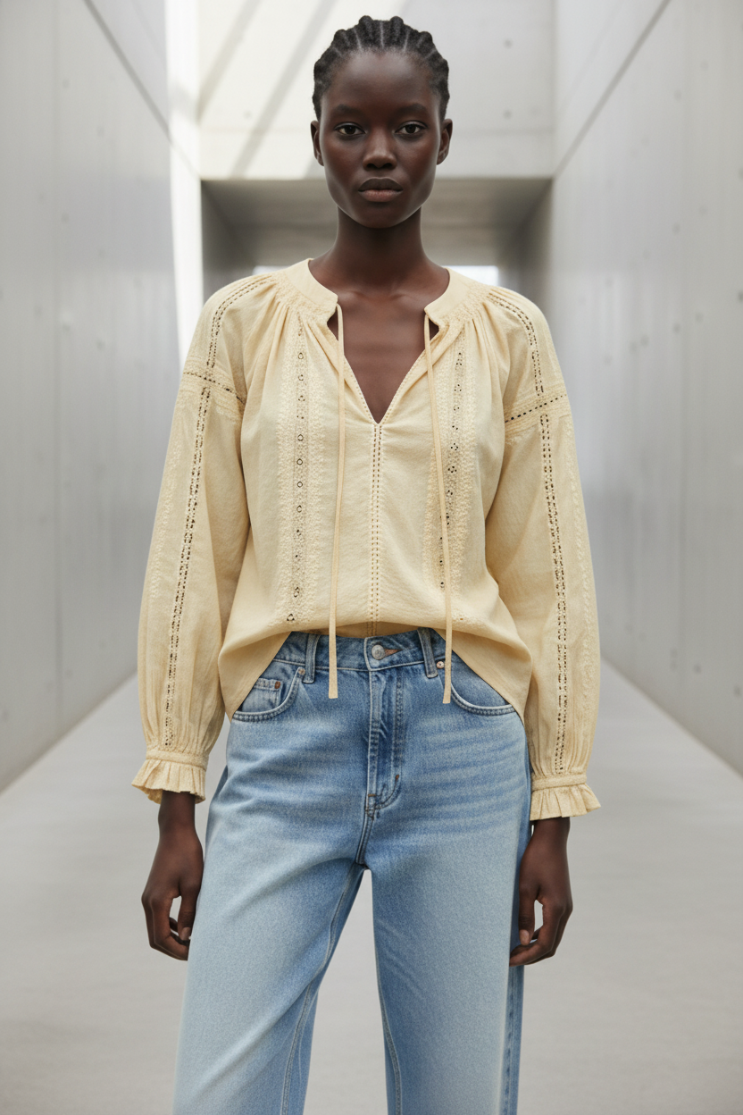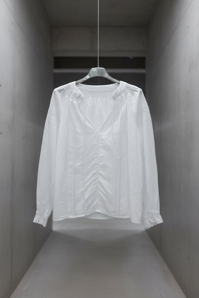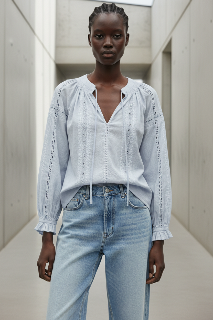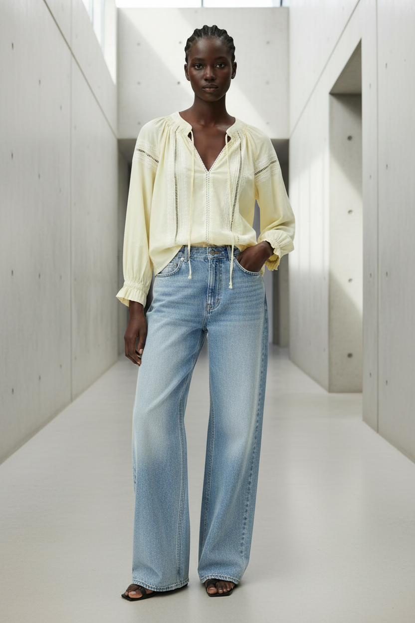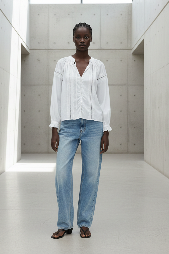 חולצה עשויה 100% כותנה בגזרת אוברסייז משוחררת, עם מפתח V עדין ושרוולים רחבים היוצרים מראה קליל ומתוחכם.
