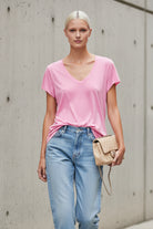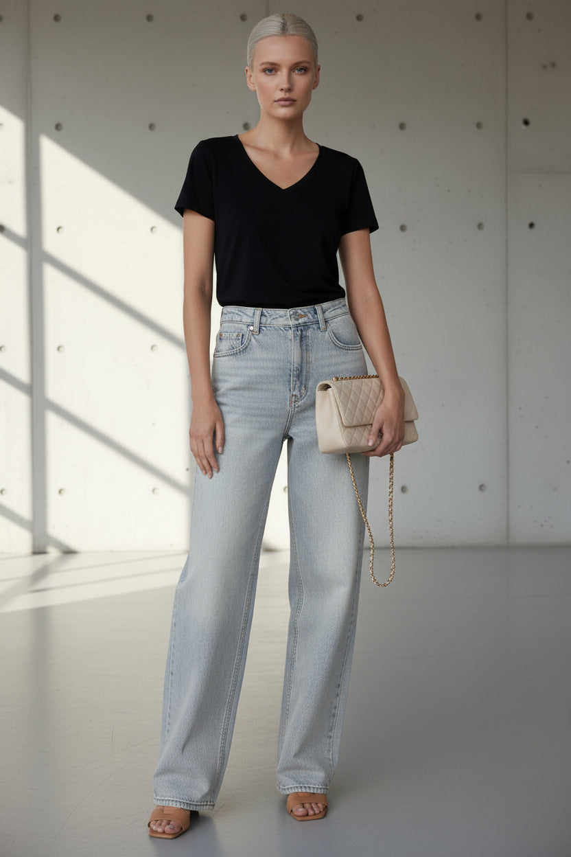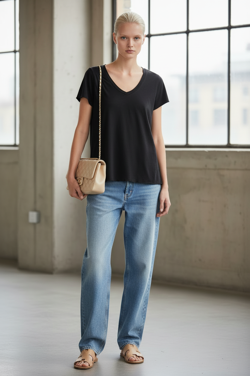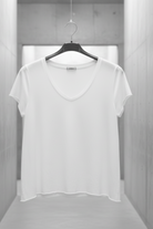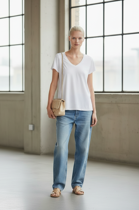 טי שירט בגזרת וי עם נפילה רכה ולוק נקי ומודרני.