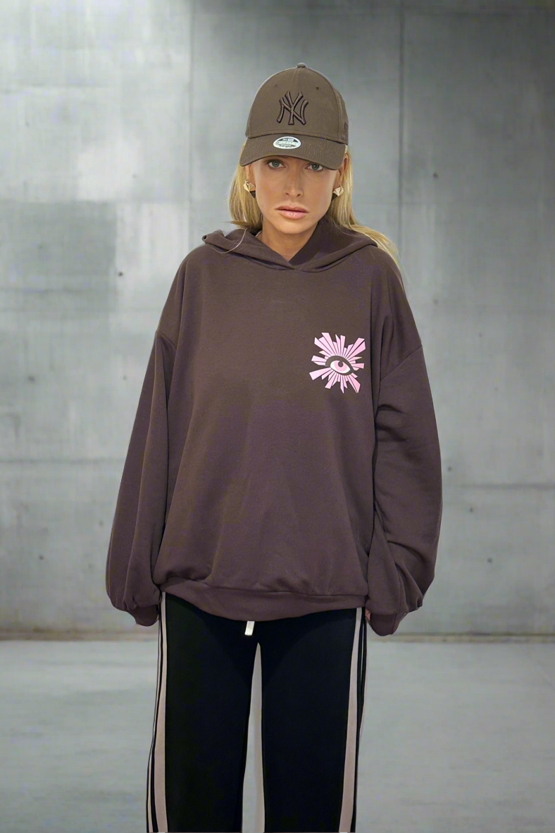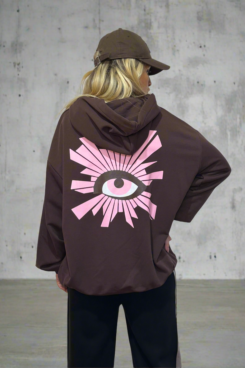 סוויטשרט אוברסייז מבד פליז רך ונעים, בגוון חום עמוק עם הדפס עין בגווני ורוד בייבי מלפנים ומאחור.