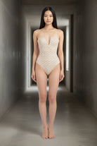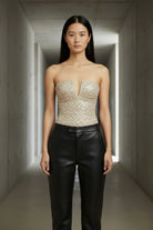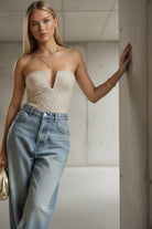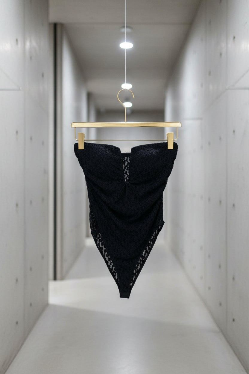 בגד גוף מחטב מבד תחרה אלגנטי בעיצוב Sweetheart עם מפתח עמוק ומחמיא שמדגיש את החזה בצורה מדויקת ועדינה.