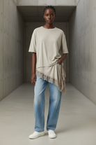 בחלק התחתון שילוב תוספת תחרה אסימטרית שמוסיפה עומק, תנועה וסטייל ייחודי ללוק.