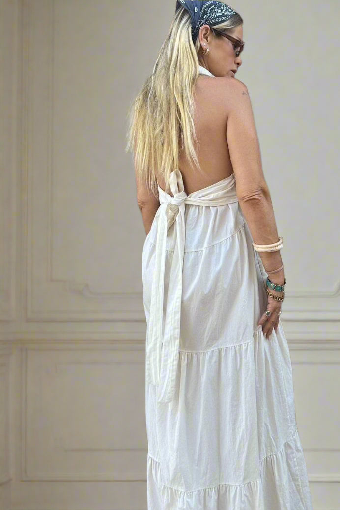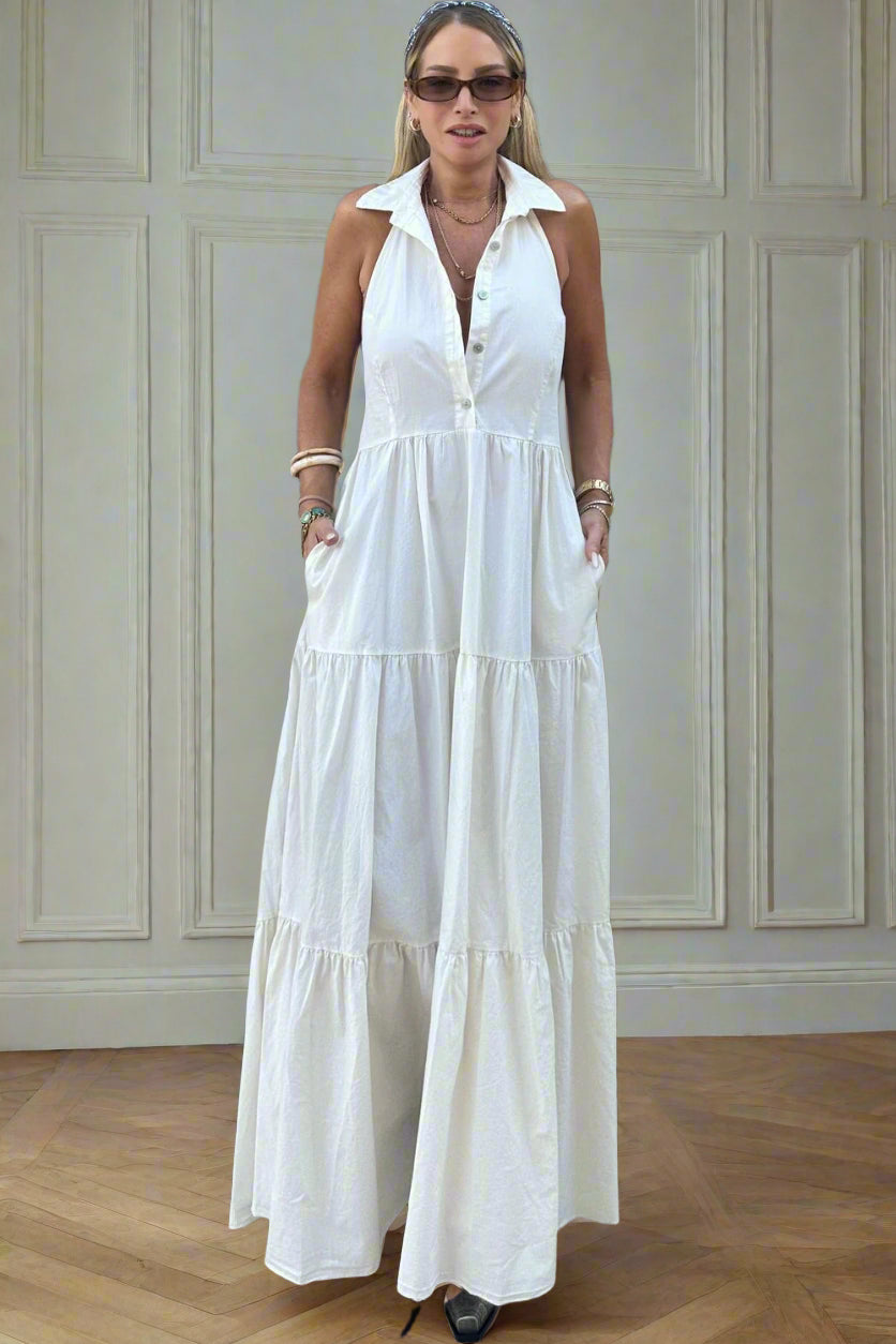 שמלת מקסי לבנה בסגנון effortless chic, עם גזרה מחמיאה ונשית. חלקה העליון מעוצב עם צווארון מחודד וכפתורים בחזית ליצירת מראה קז’ואלי-אלגנטי, והחצאית בנויה משכבות רחבות ונשפכות המעניקות תנועה ורכות. השמלה מגיעה עם כיסים צדדיים לנוחות מירבית ומשדרת שילוב מושלם בין נינוחות יומיומית לסטייל מוקפד