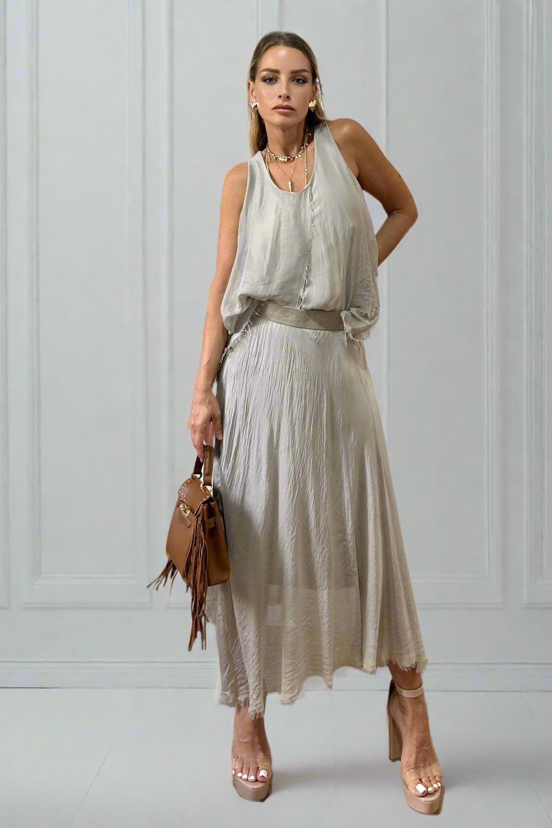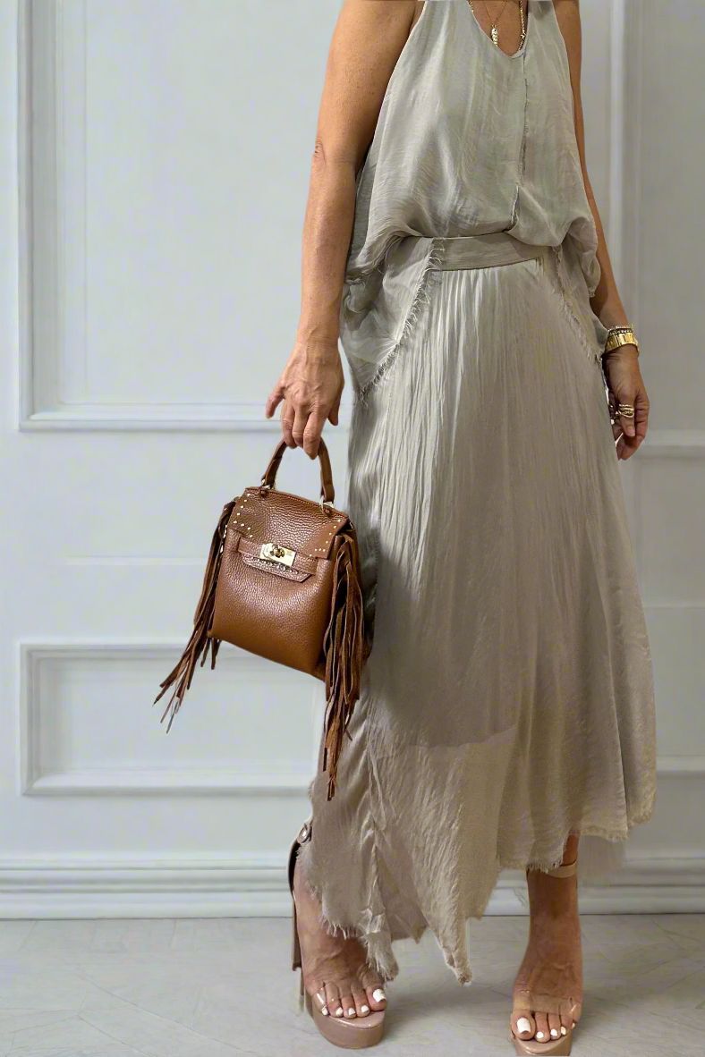 חצאית אסימטרית מבד משי קליל ונשפך, בגזרה מתרחבת שמעניקה מראה אלגנטי אך נינוח.