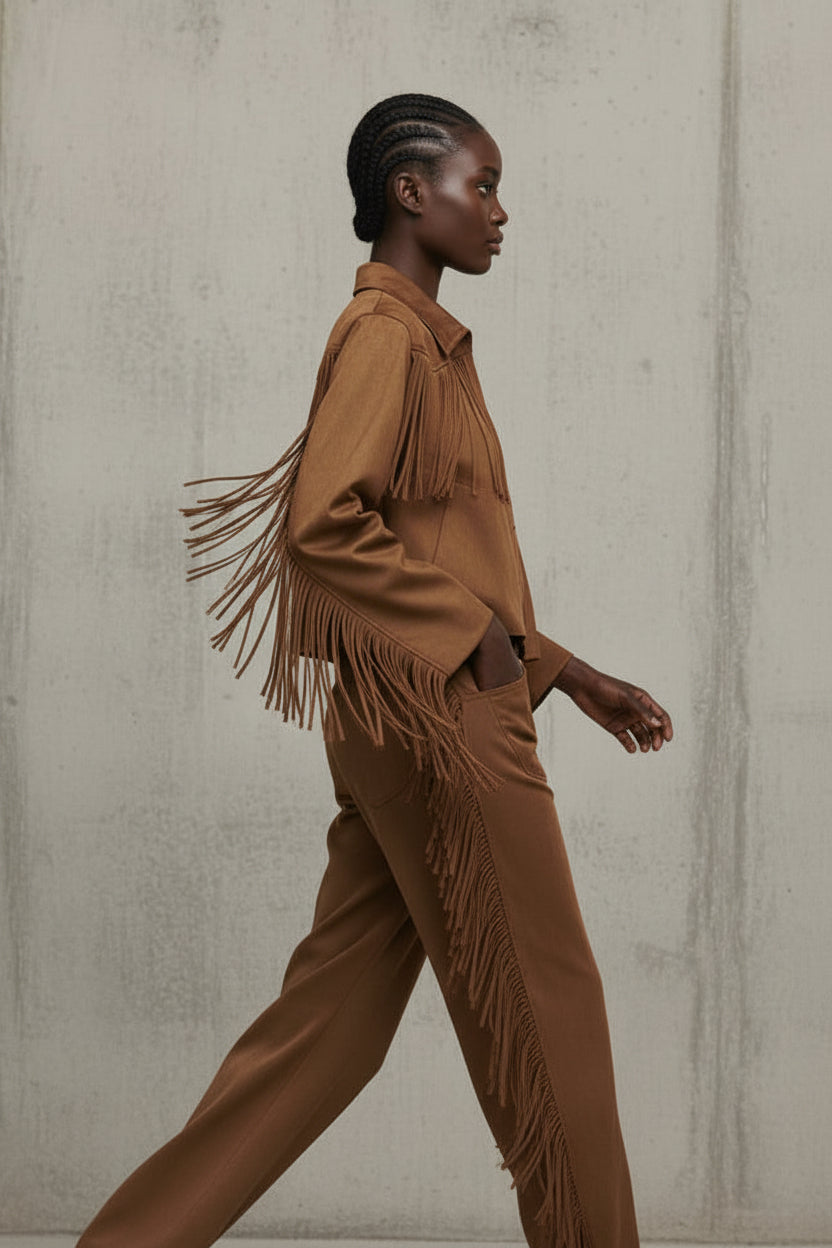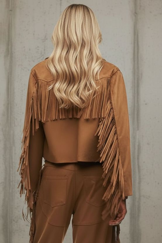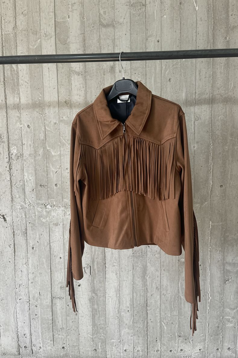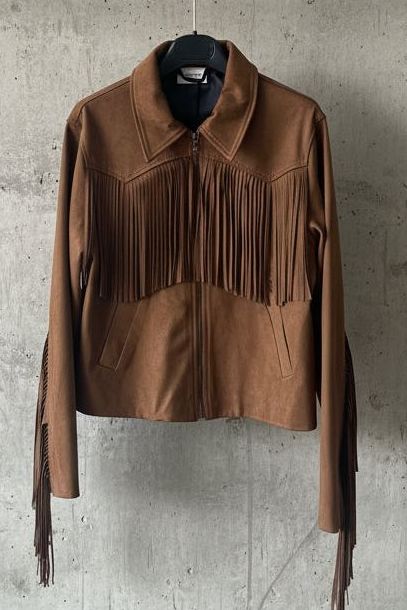 עשוי עור זמש רך ונעים למגע, עם פרנזים ארוכים בחזה ובשרוולים שמוסיפים תנועה, חופש וסטייטמנט לכל לוק.