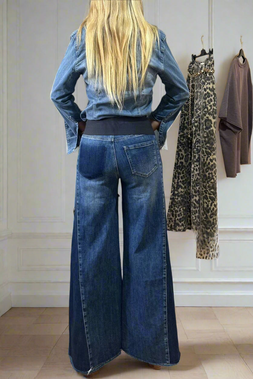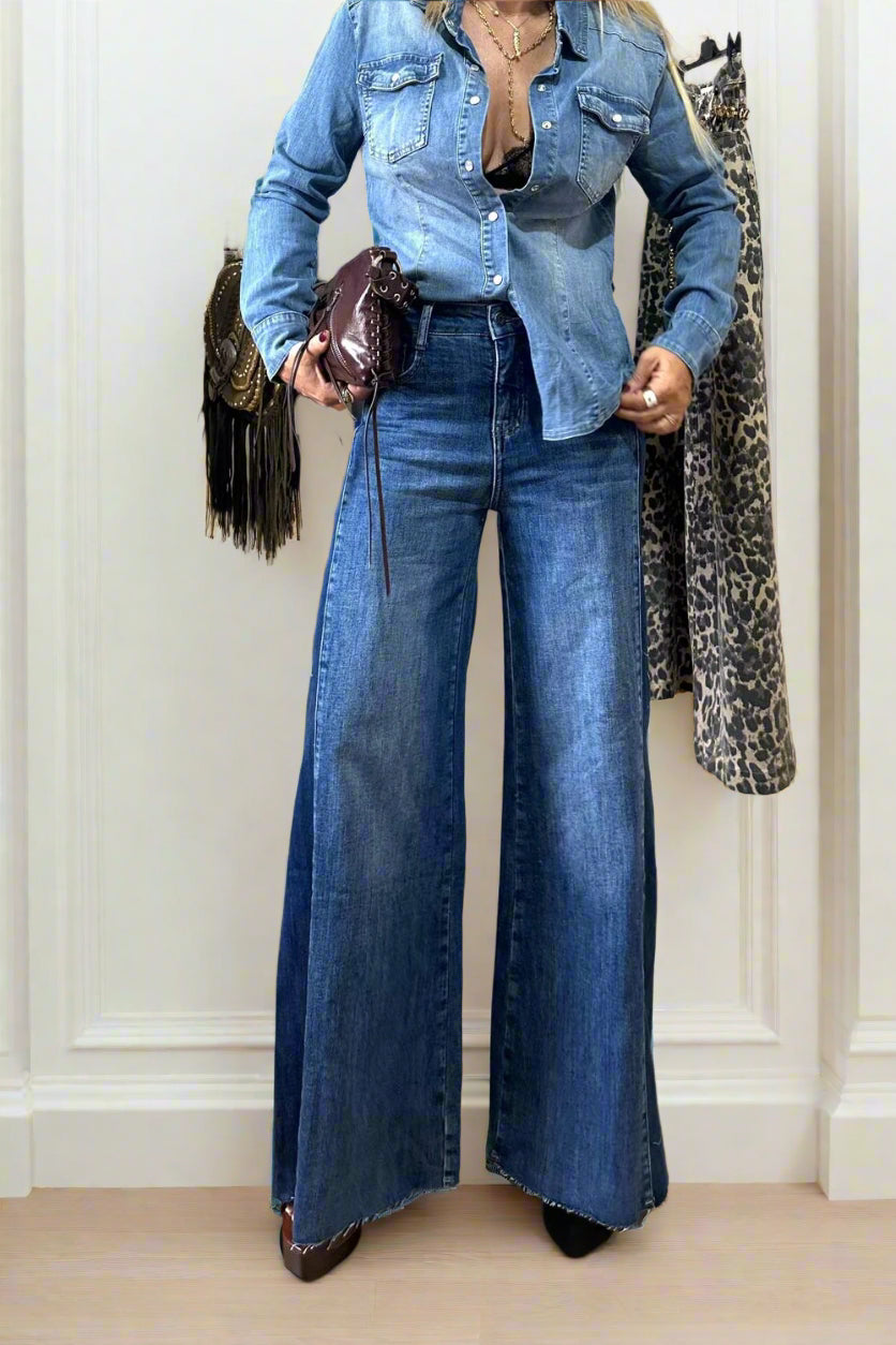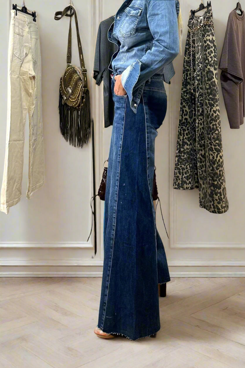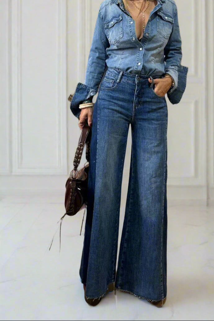 הג’ינס שאת חייבת לעונה – גזרה גבוהה שמחמיאה לגוף ונשפכת למטה ברוחב מושלם. ג’ינס פלייר (Flare) בגוון כחול קלאסי עם שטיפות עדינות, באורך מלא שמאריך את הרגליים ומשדר שיק effortless.
