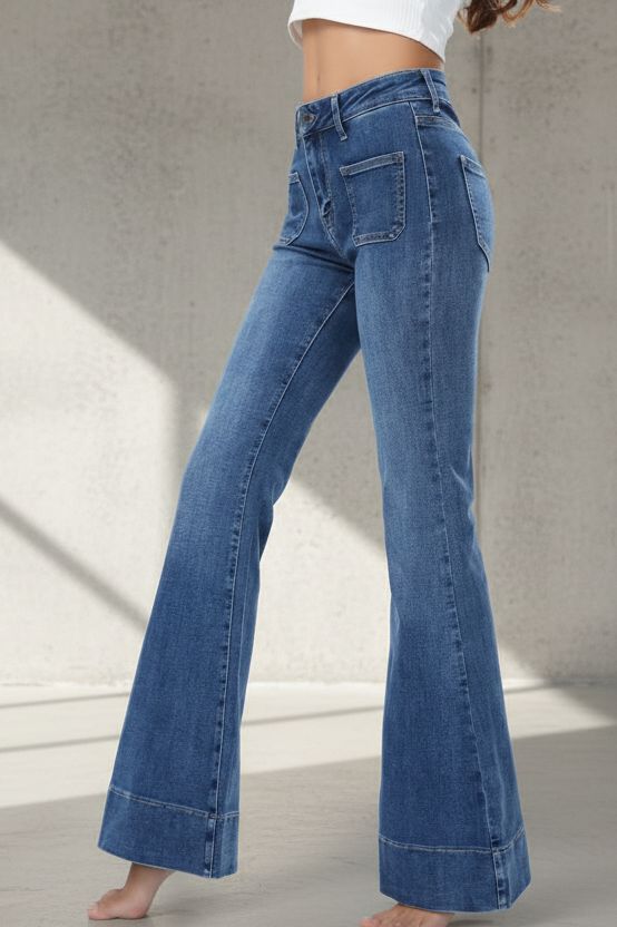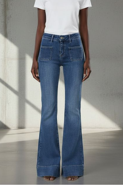ג׳ינס בגזרה גבוהה ומחטבת, צמוד במותן ובירך ונפתח בעדינות לפעמון מחמיא שמאריך את הרגליים ויוצר סילואט נשי וחזק.