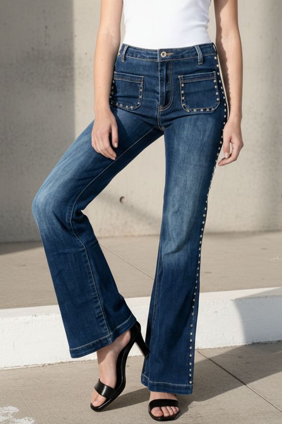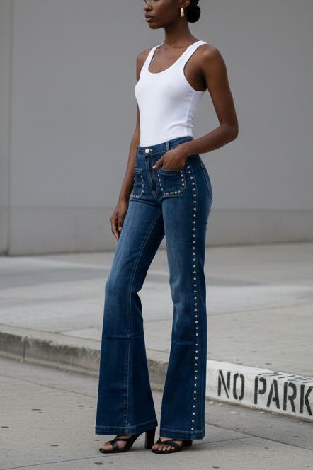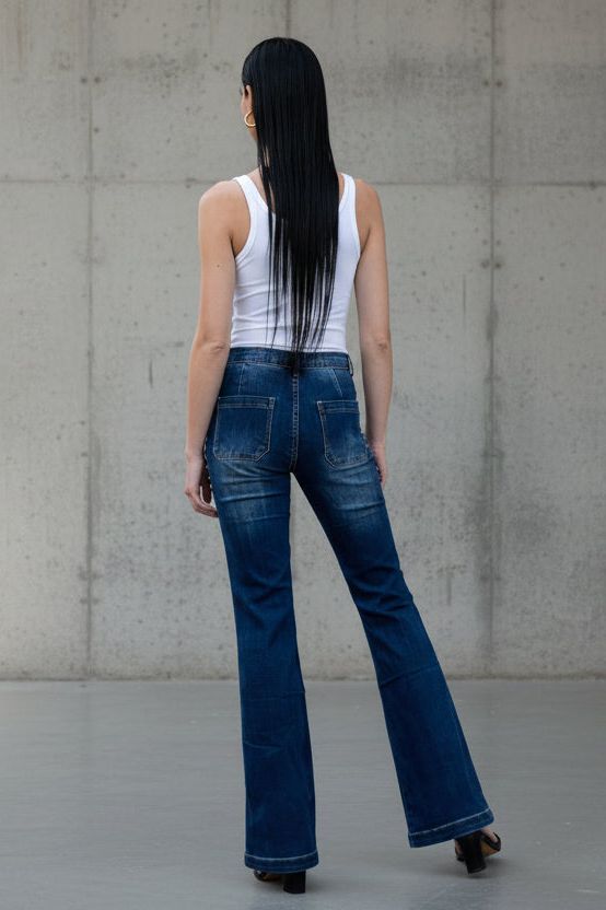 הג’ינס יושב גבוה על המותן, אוסף ומדגיש את קו המותניים והירכיים, ונפתח בעדינות מהברך למראה ארוך, נשי ומאוד מחטב.