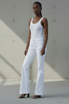 הג’ינס יושב גבוה על המותן, אוסף ומדגיש את קו המותניים והירכיים, ונפתח בעדינות מהברך למראה ארוך, נשי ומאוד מחטב.