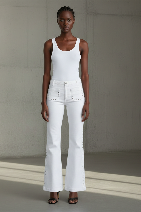 ג’ינס מחמיא בגזרת Flare מתרחבת, עם נוכחות חזקה וסטייל על־זמני.