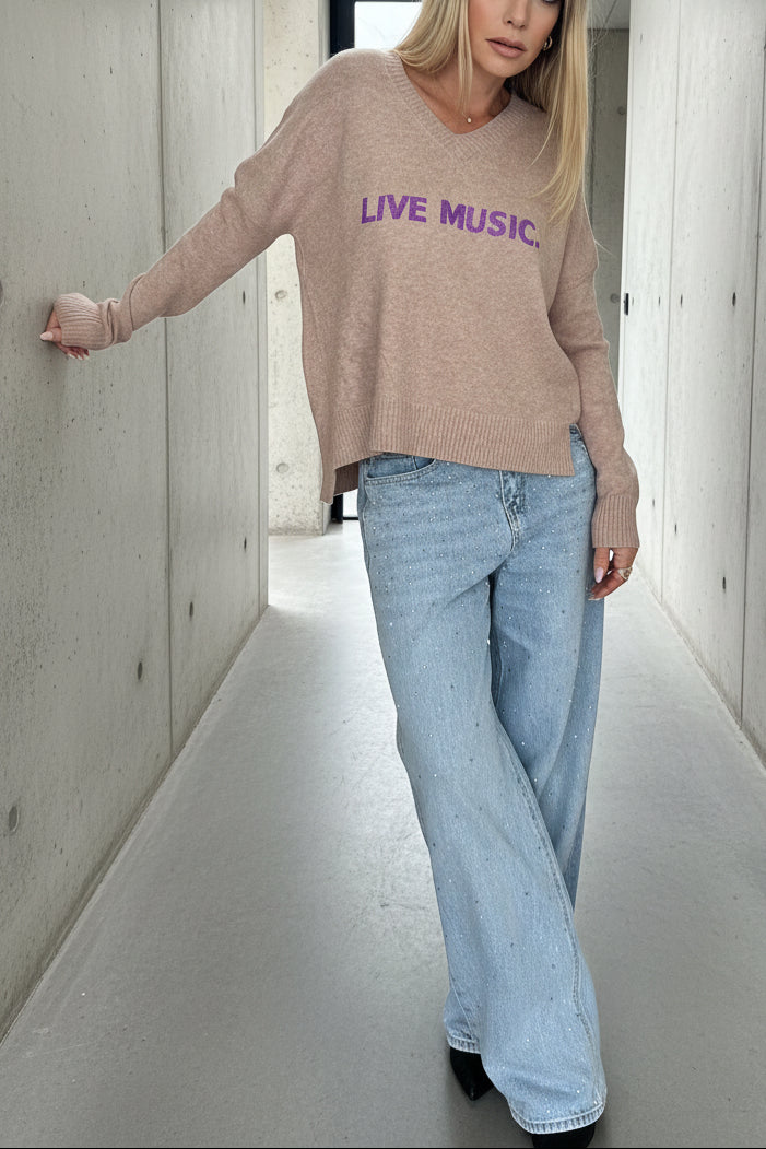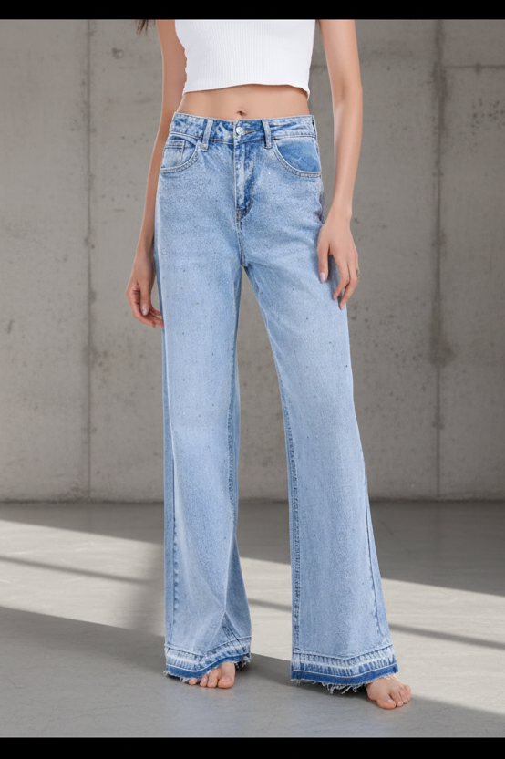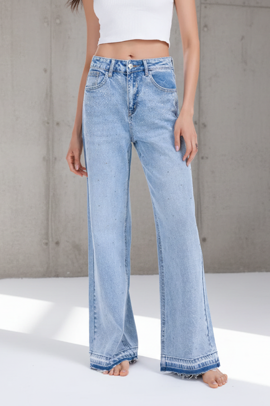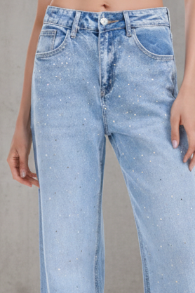ג׳ינס בגזרה ישרה-רחבה עם יהלומים קטנים על כל הגינס -הטרנד המוביל של העונה.