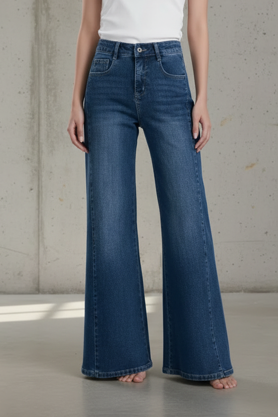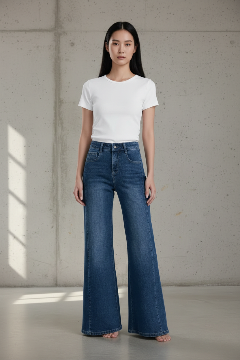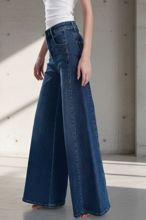 ג׳ינס מחמיא במיוחד בגזרה רחבה ונשפכת, עם מותן גבוהה שמדגישה את קו המותניים ומאריכה את הרגליים.