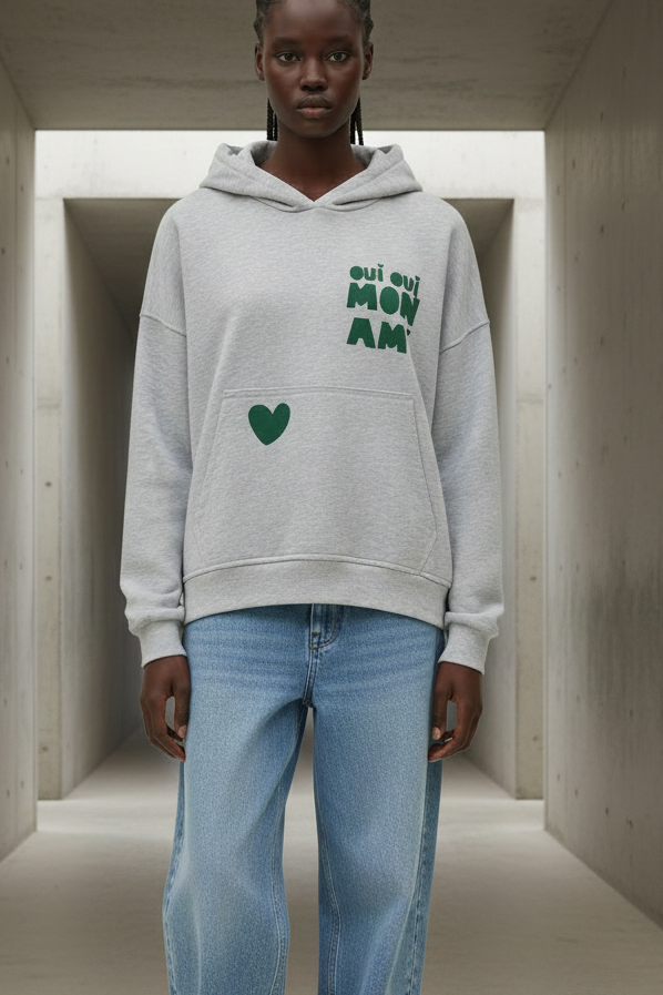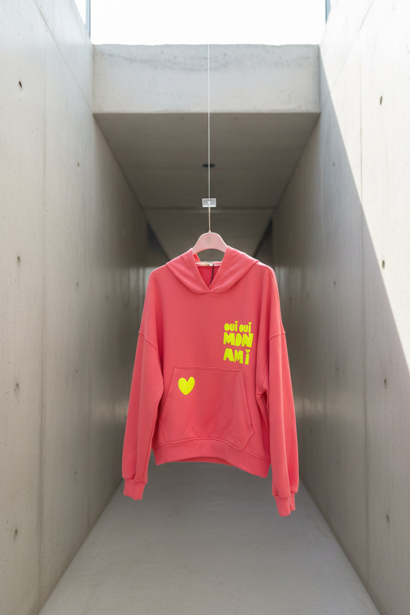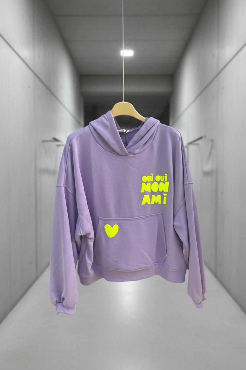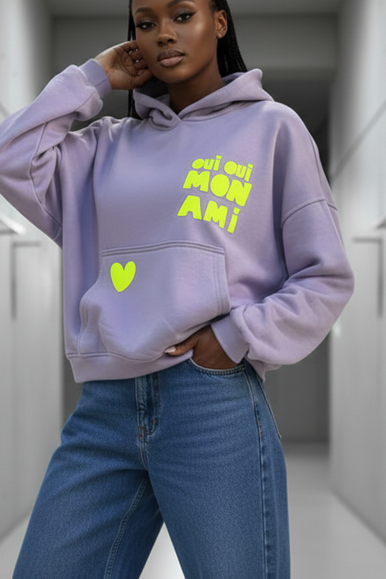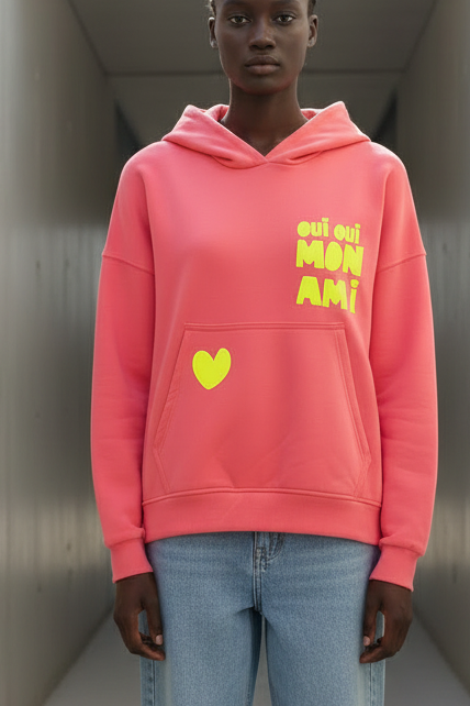 הדפס קדמי בצבעי ניאון (לב וביטוי “oui oui mon ami”) מוסיף טאץ’ אופנתי ושמח.