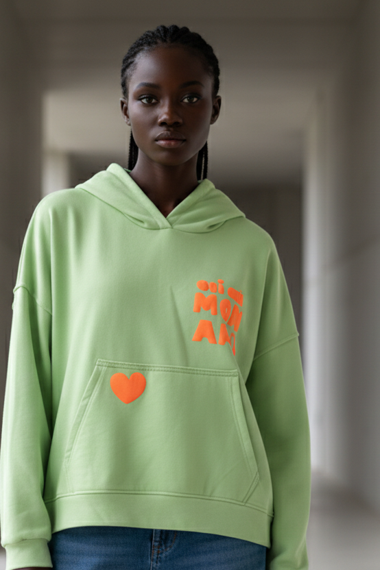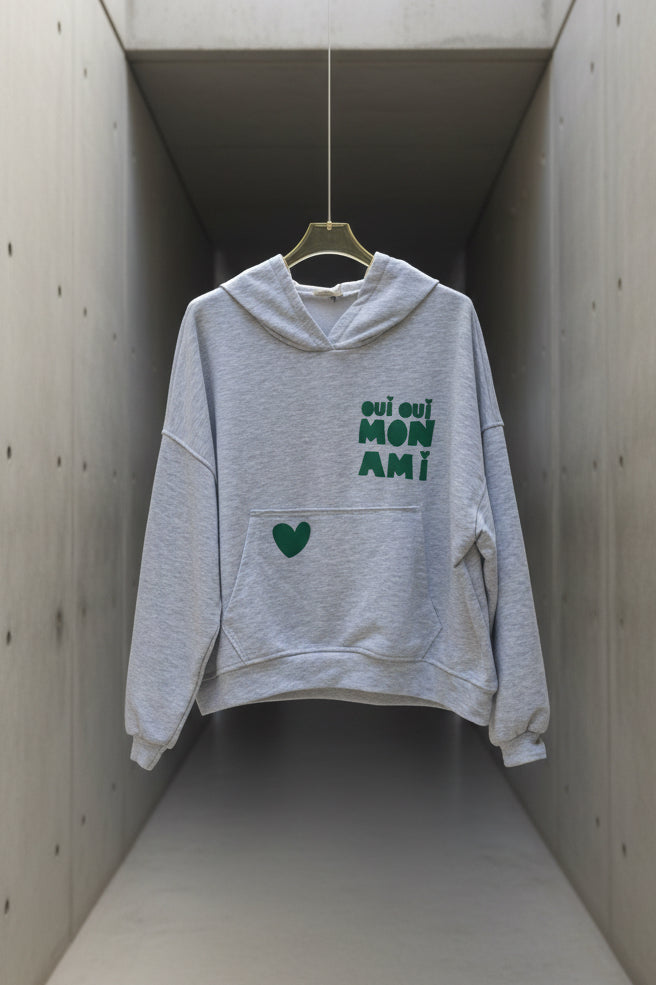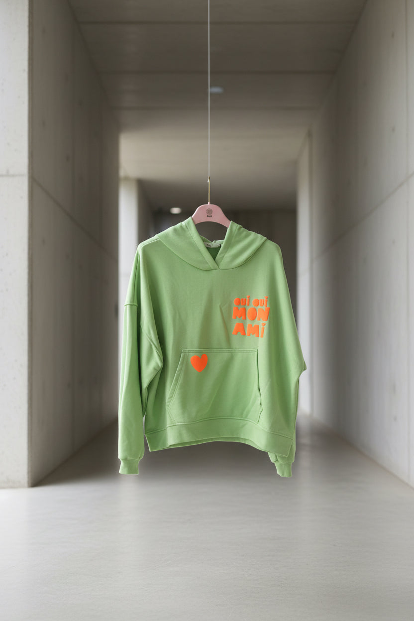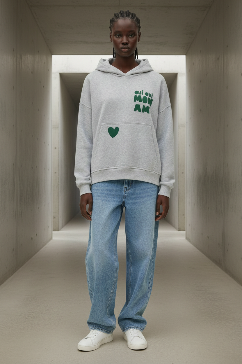 הדפס קדמי בצבעי ניאון (לב וביטוי “oui oui mon ami”) מוסיף טאץ’ אופנתי ושמח.