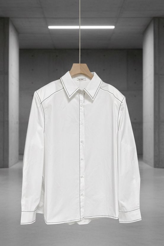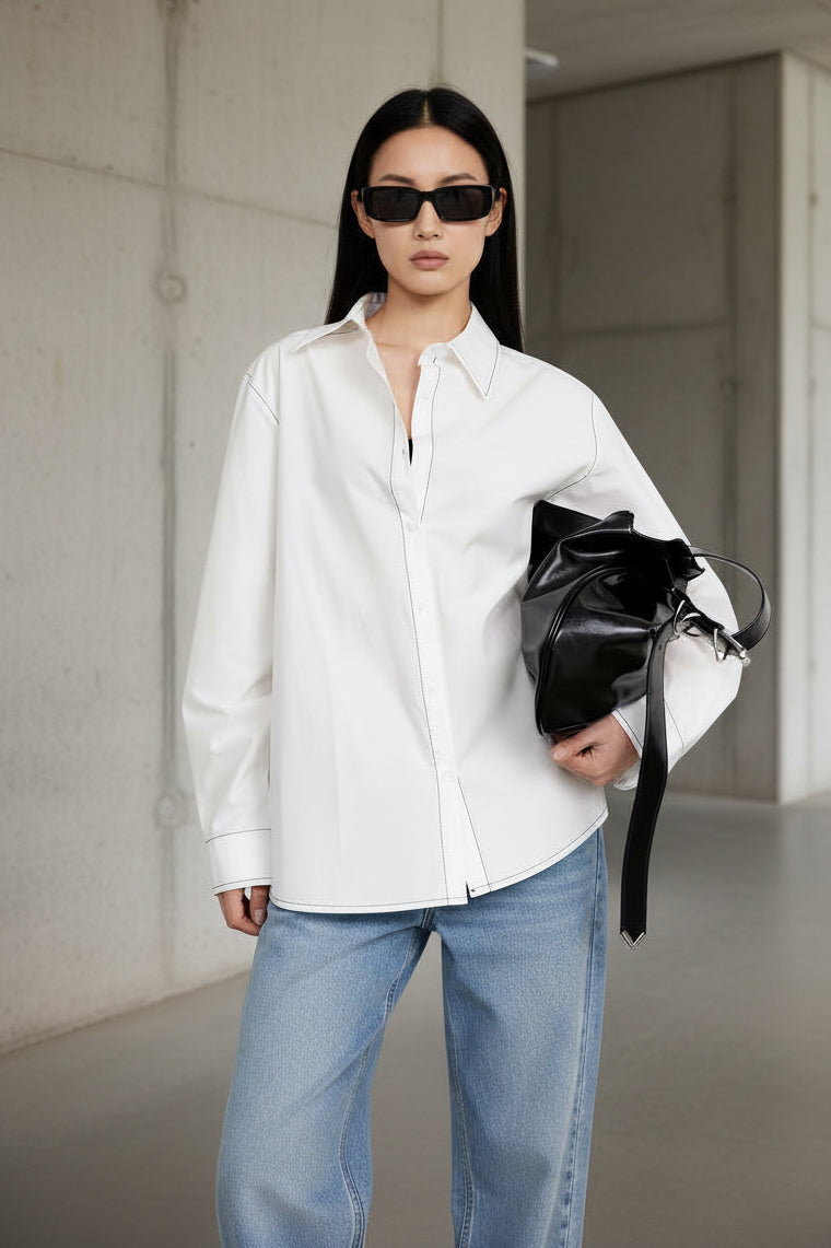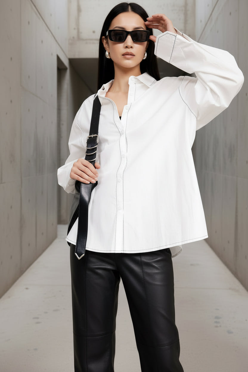 חולצה לבנה בגזרת אוברסייז עם תפרי קונטרסט דקים שמוסיפים לה מראה נקי, מעוצב ומדויק.