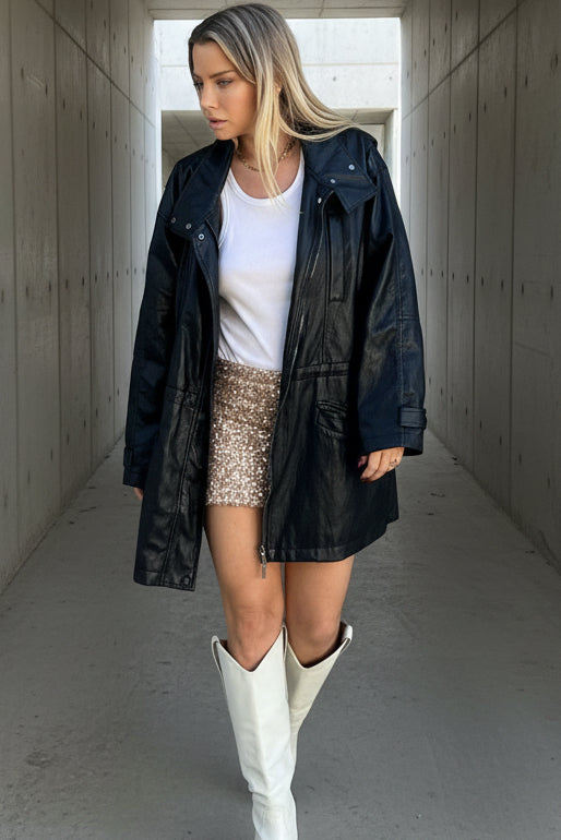 מגיע בצבעים שחור וחום בגזרה מחמיאה ואלגנטית, בעיצוב שמשתלב מושלם עם כל לוק , בעל צווארון רחב, סגירת רוכסן קדמית וכיסים פונקציונליים למראה שיקי , הבד רך ובעל מראה עור איכותי,