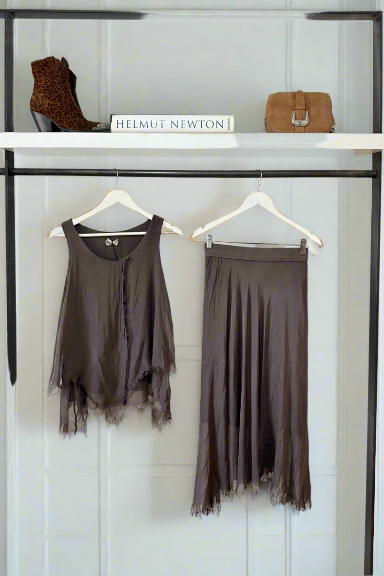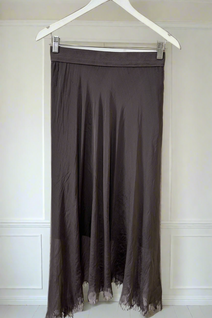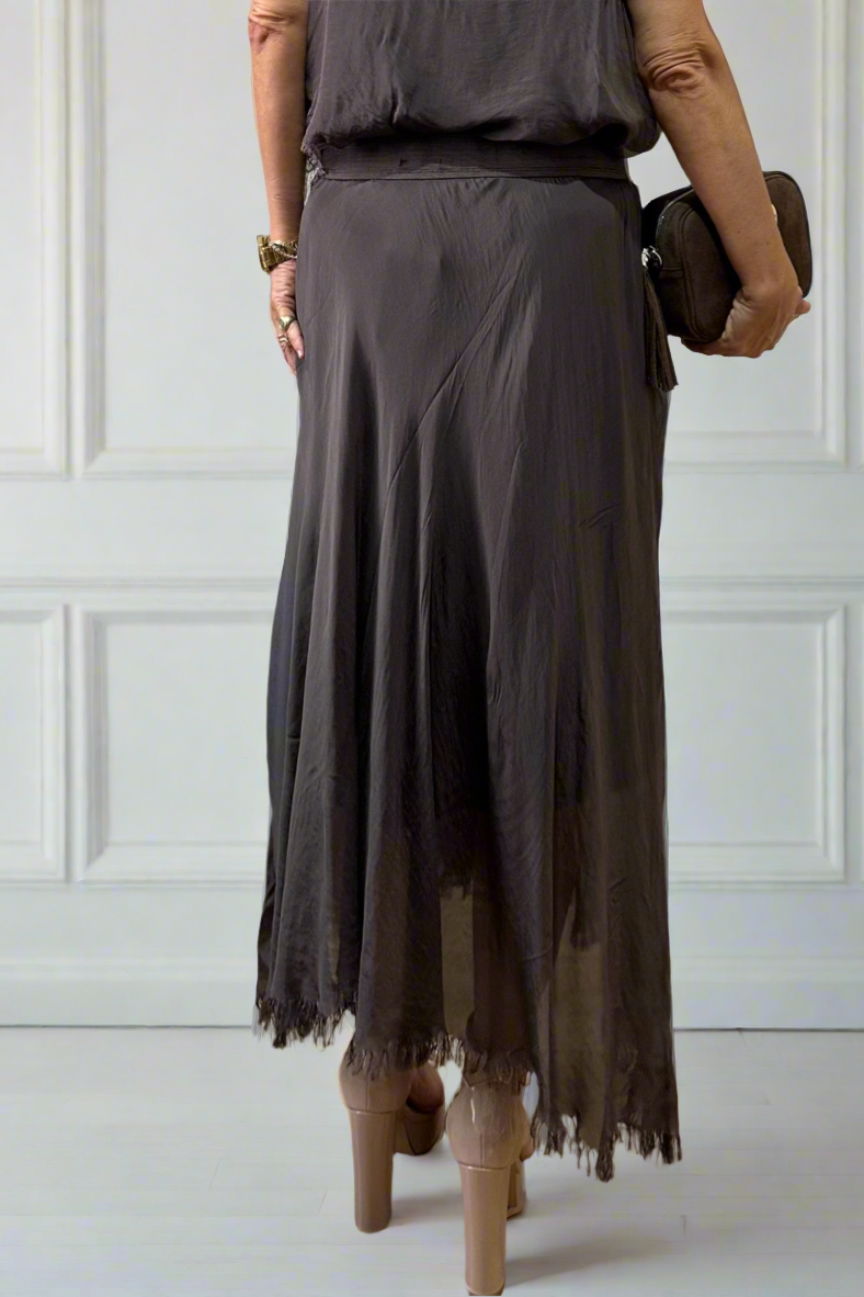 חצאית אסימטרית מבד משי קליל ונשפך, בגזרה מתרחבת שמעניקה מראה אלגנטי אך נינוח.