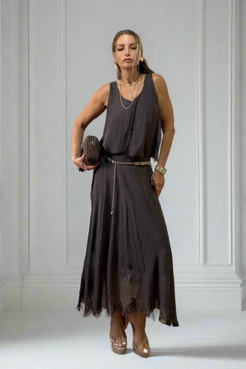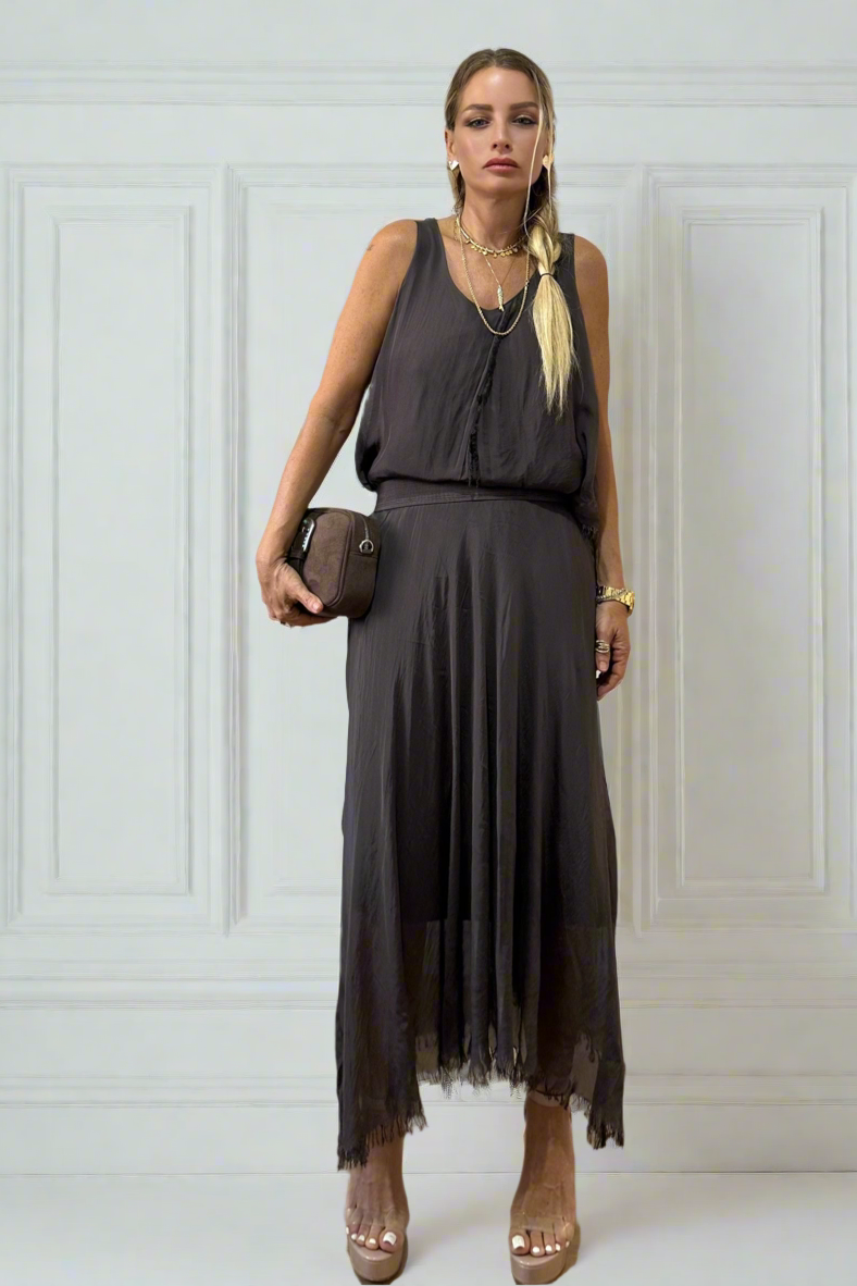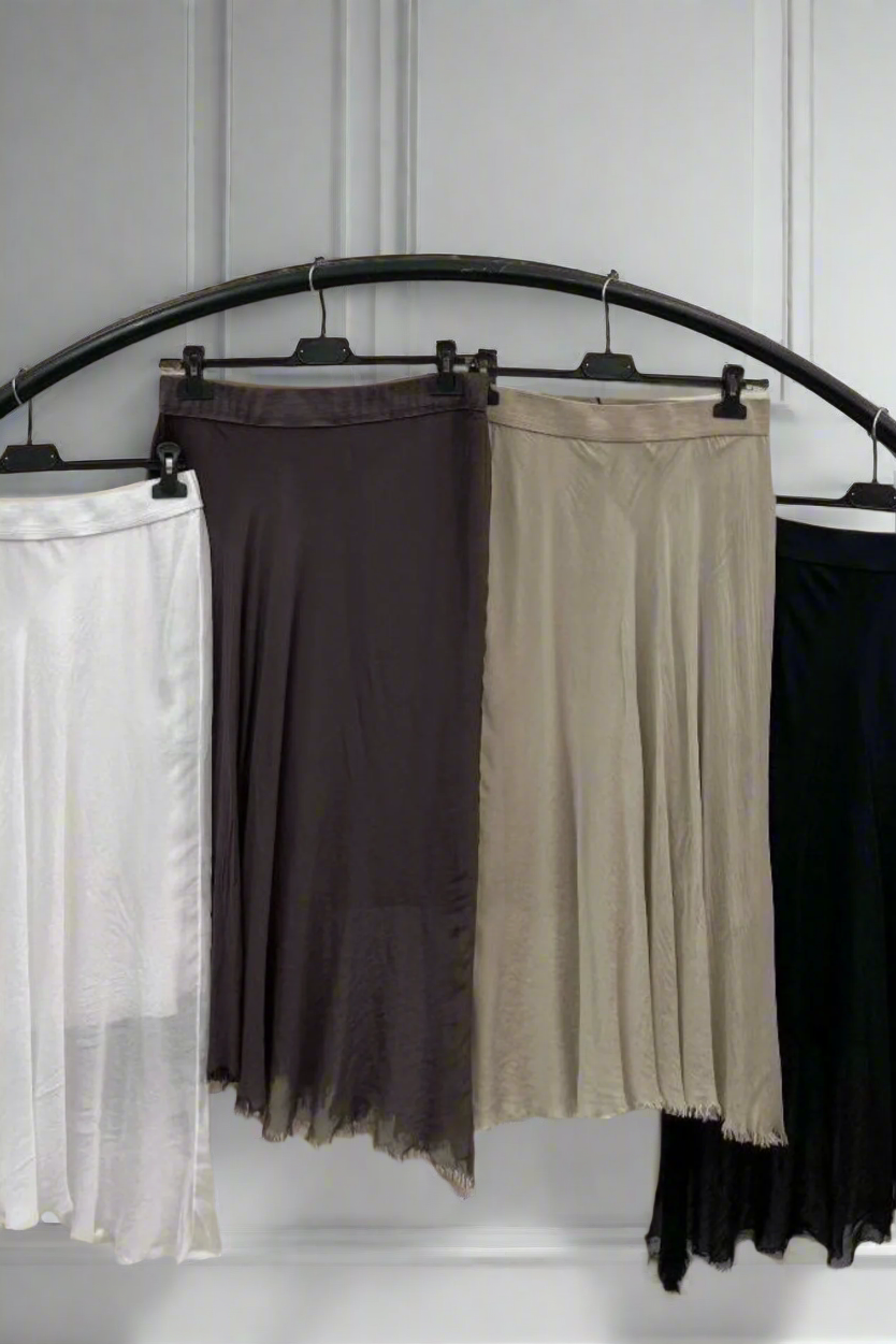 ושולי החצאית מעוצבים בגימור חופשי שמוסיף טאץ’ בוהמייני מתוחכם. זמינה במגוון צבעים נטרליים וקלאסיים – לבן ,בז חום ושחור, ומשתלבת בקלות עם חולצות בסיס, קרופ-טופים או חולצות מכופתרות ליצירת לוק יום-יומי או ערב קליל