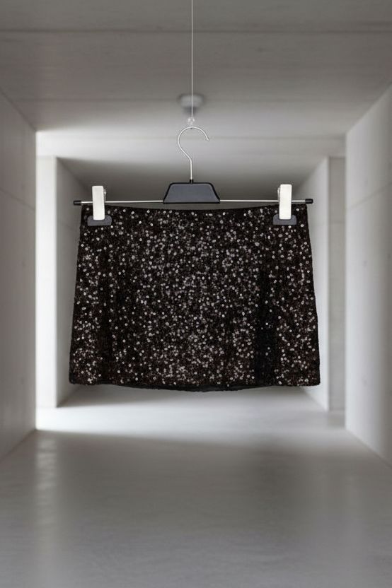 חצאית פאייטים קצרה ונוצצת בגזרת מיני מחמיאה, עם הברקה עדינה שמייצרת לוק אלגנטי ונועז.